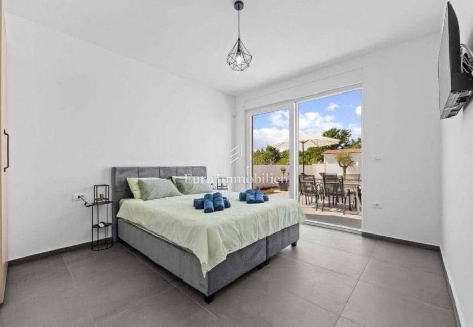 The villa is situated on a 692 m² plot and offers 139 m² of living space. It consists of an entrance hallway, a spacious open-plan living room with kitchen and dining area, three bedrooms and three bathrooms. Two bedrooms have direct access to the garden and pool. The house also includes a guest WC with laundry area and a technical room.