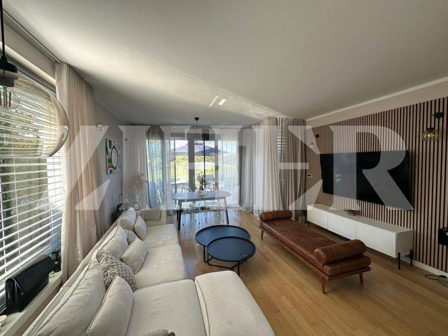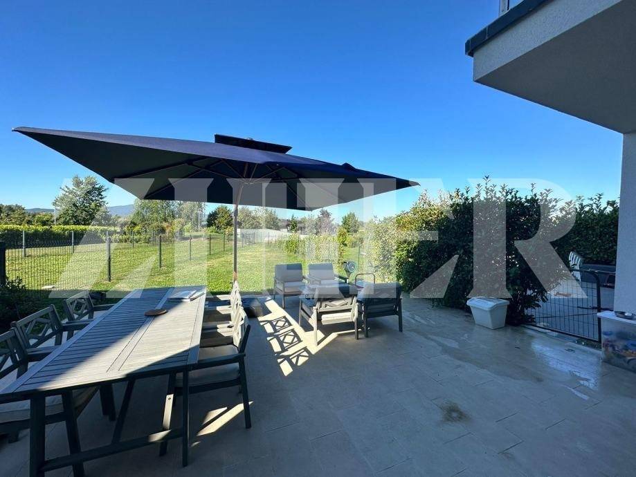 Layout:Ground floor: Modern kitchen connected to a bright living room with access to covered and uncovered terrace and a private garden 350m2, plus a convenient guest toilet.First floor: Three bedrooms and two bathrooms, along with a cozy loggia overlooking the garden.Basement: An open space with a playroom and home gym.The property includes two private parking spaces, as well as additional free parking outside the barrier.