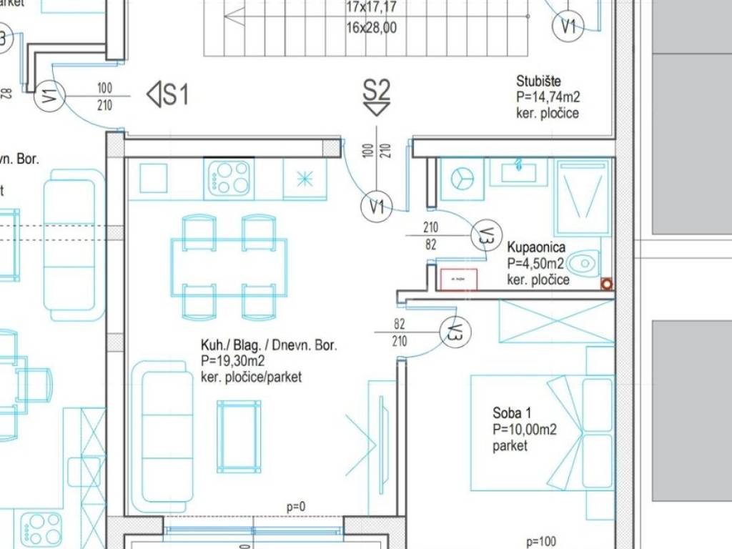 STAN S2 u prizemlju s vrtom, jednosoban, pov. 47.95 m2, sadrži: dnevnog boravka s blagovaonicom i kuhinjom (pov. 19.30 m2), spavaću sobu (pov. 10 m2), kupaonicu (pov. 4.50 m2) i terasu (pov. 7.30 m2).