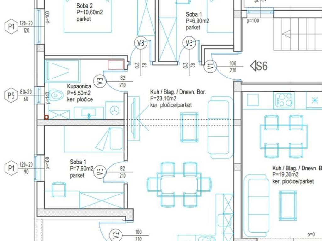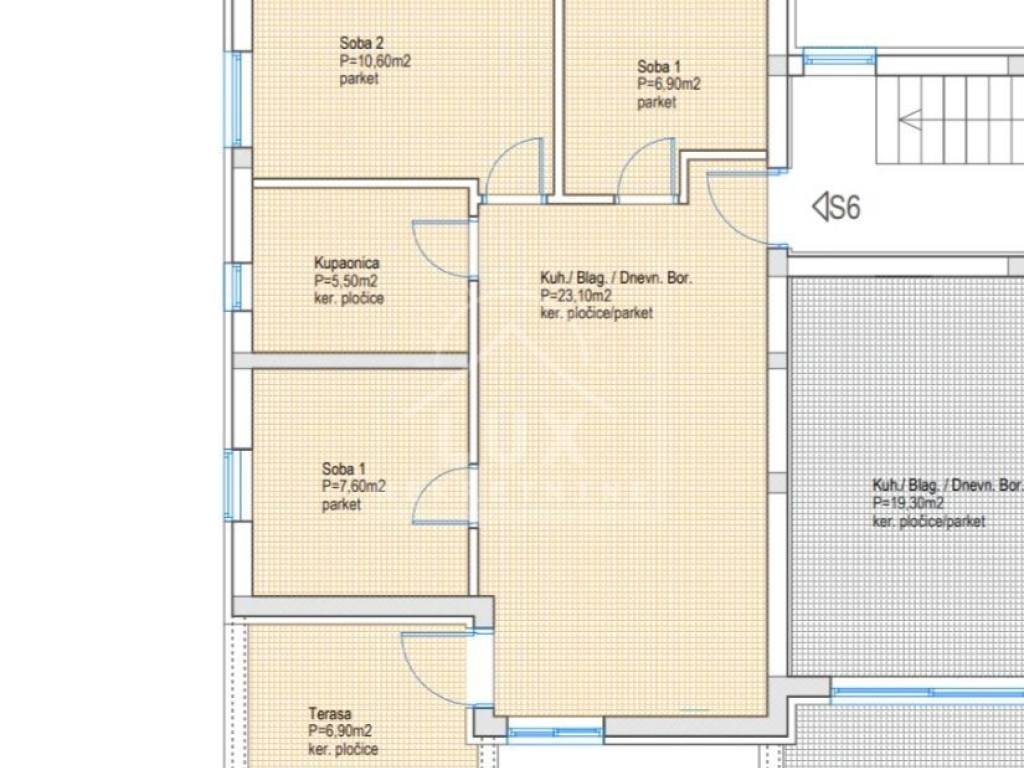 STAN S6 na 2. katu, trosoban, sadrži: dnevni boravak s blagovaonicom i kuhinjom (pov. 23.10 m2), tri spavaće sobe (pov. 10.60 m2, 7.60 m2 i 6.90 m2), kupaonicu (pov. 5.50 m2) i terasu (pov. 6.90 m2).