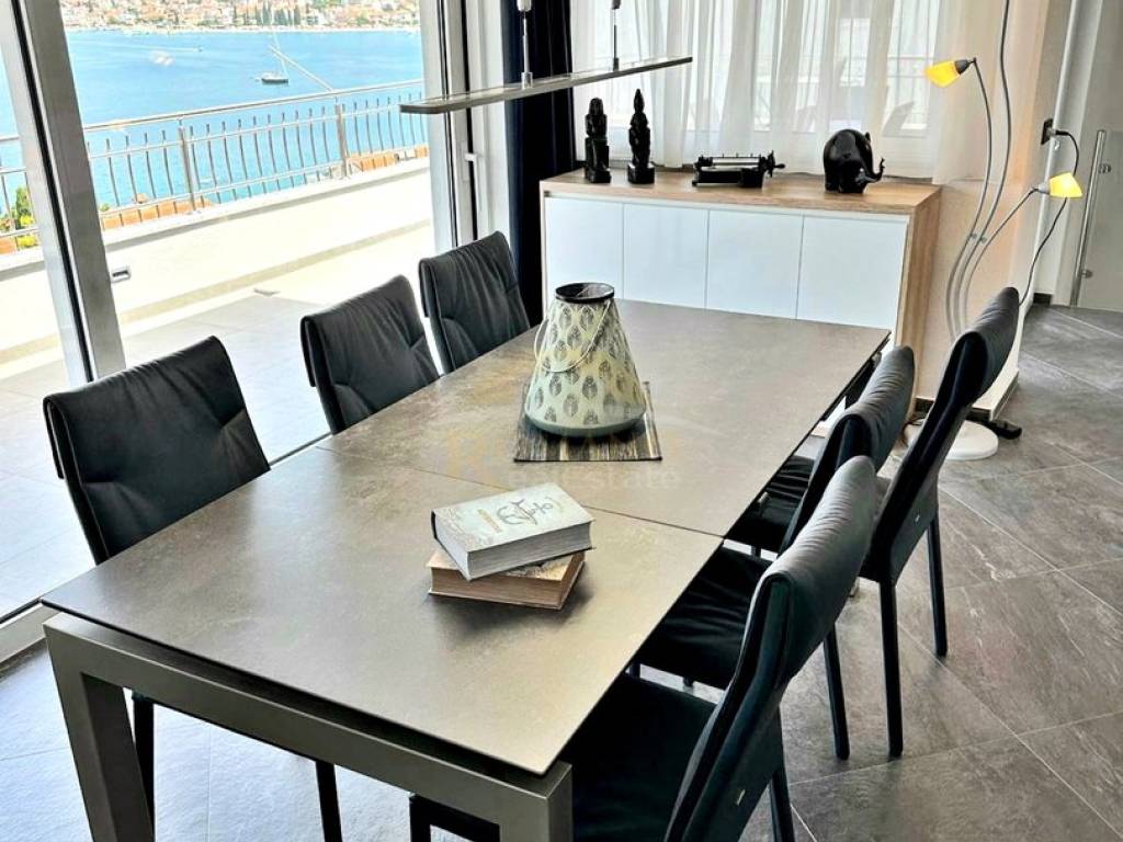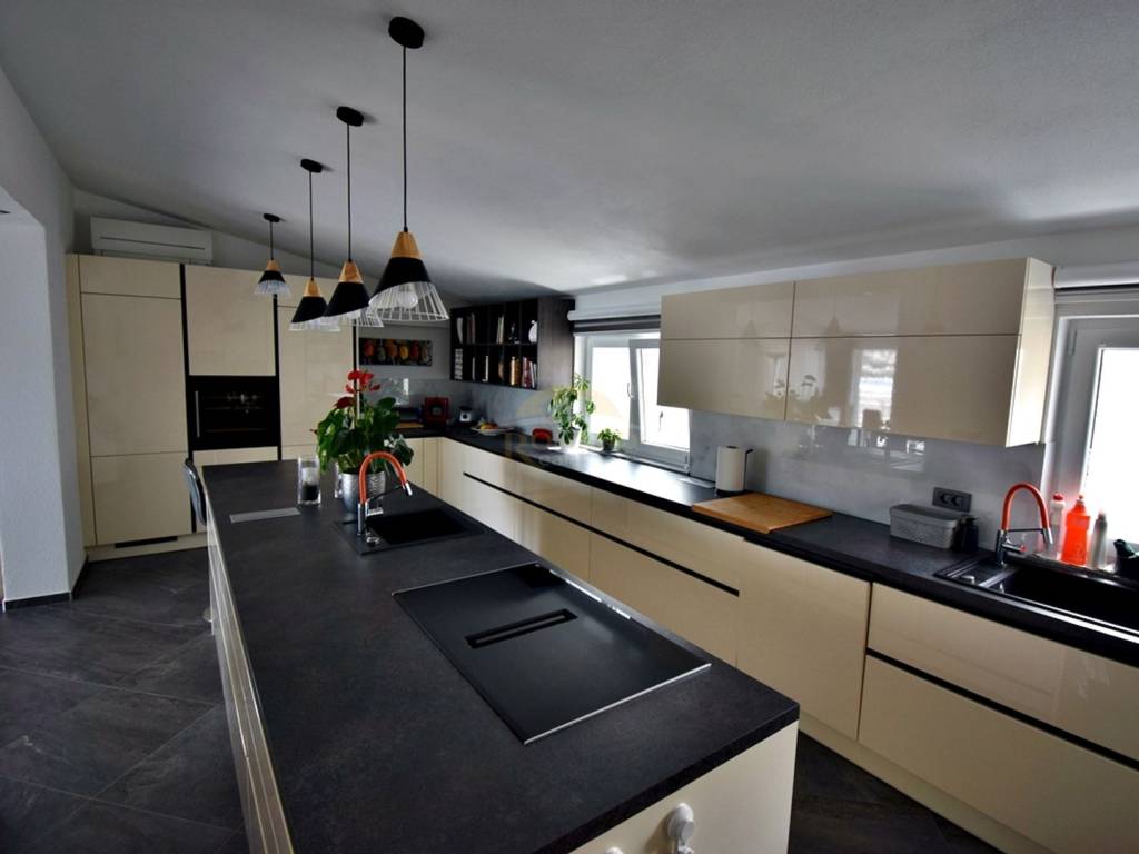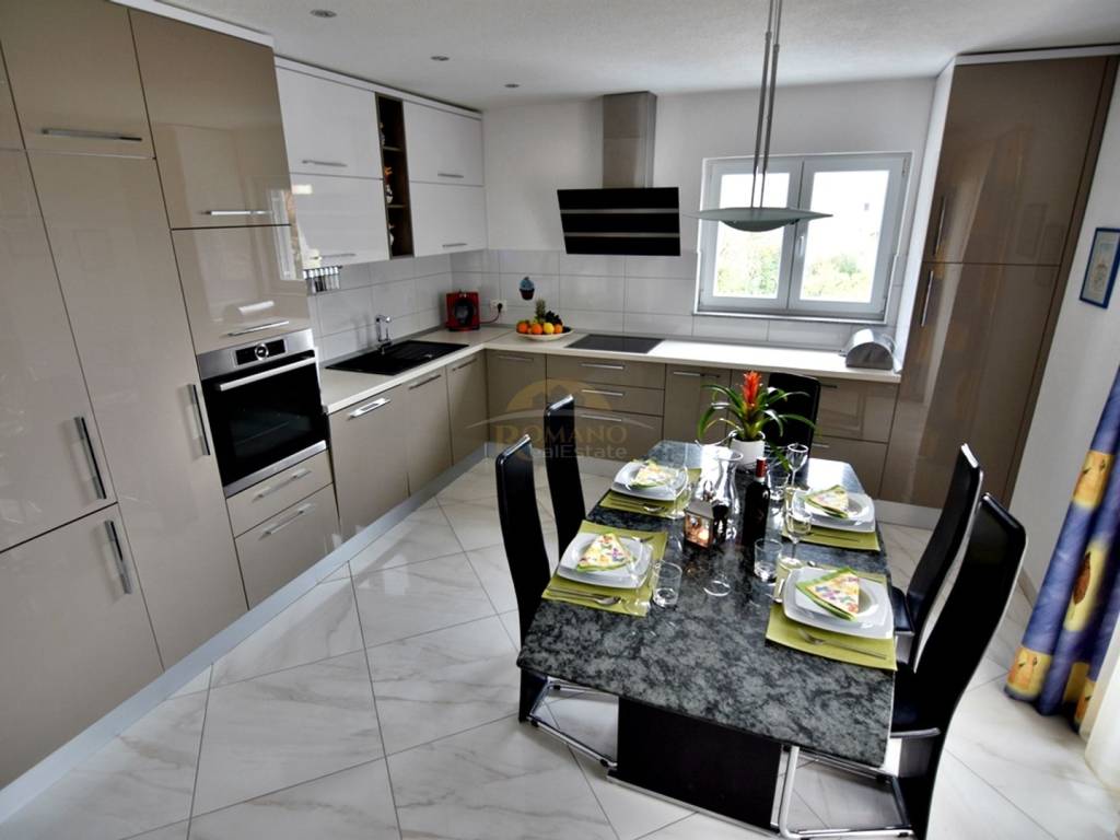 On the second floor of the house is a large, two-story apartment with an open view. The apartment has a net area of over 230 m2. On the upper level, it consists of an entry hall, a large living area with a dining room, a large modern kitchen, a bathroom, a bedroom, a storage room, and a large terrace. A staircase leads to the lower level, which is on the same plane as the first floor, where you will find another bathroom, a study, and a bedroom.