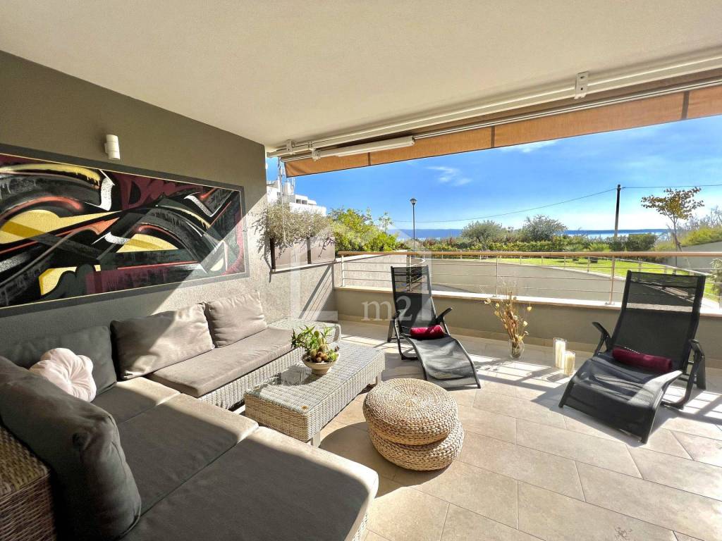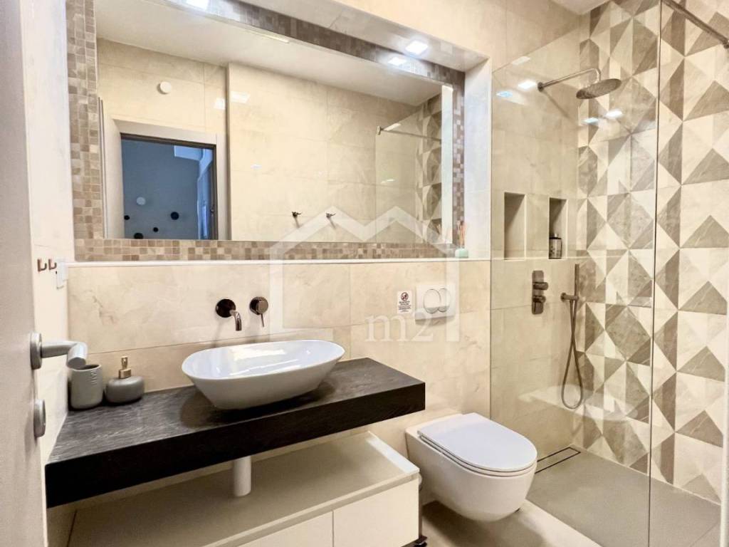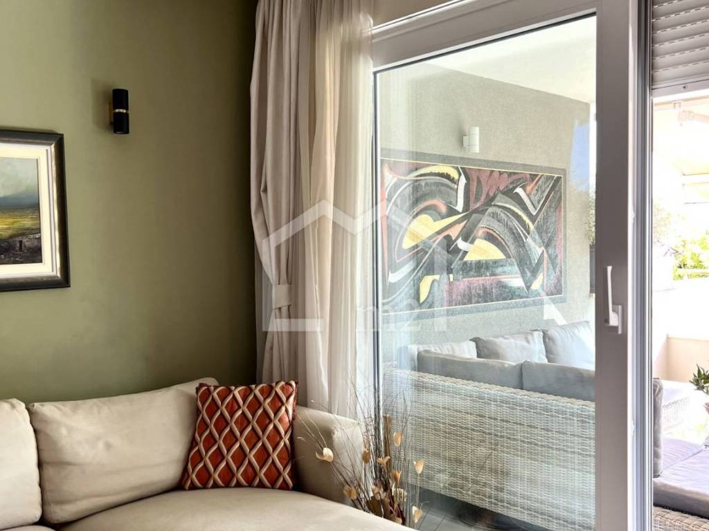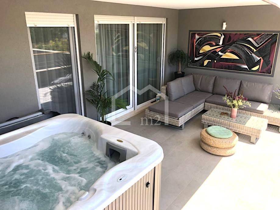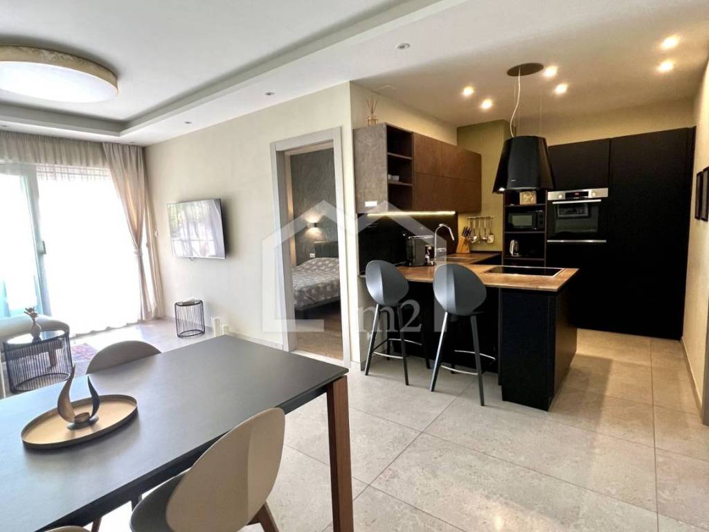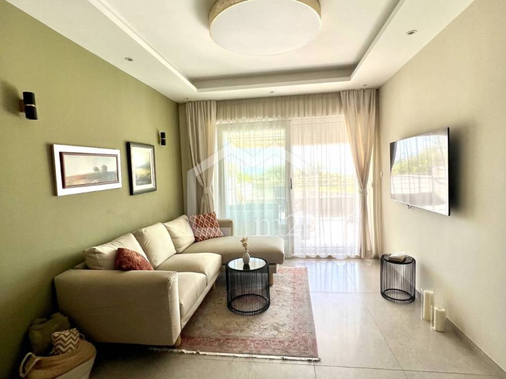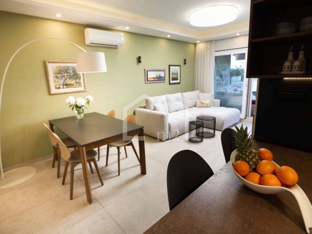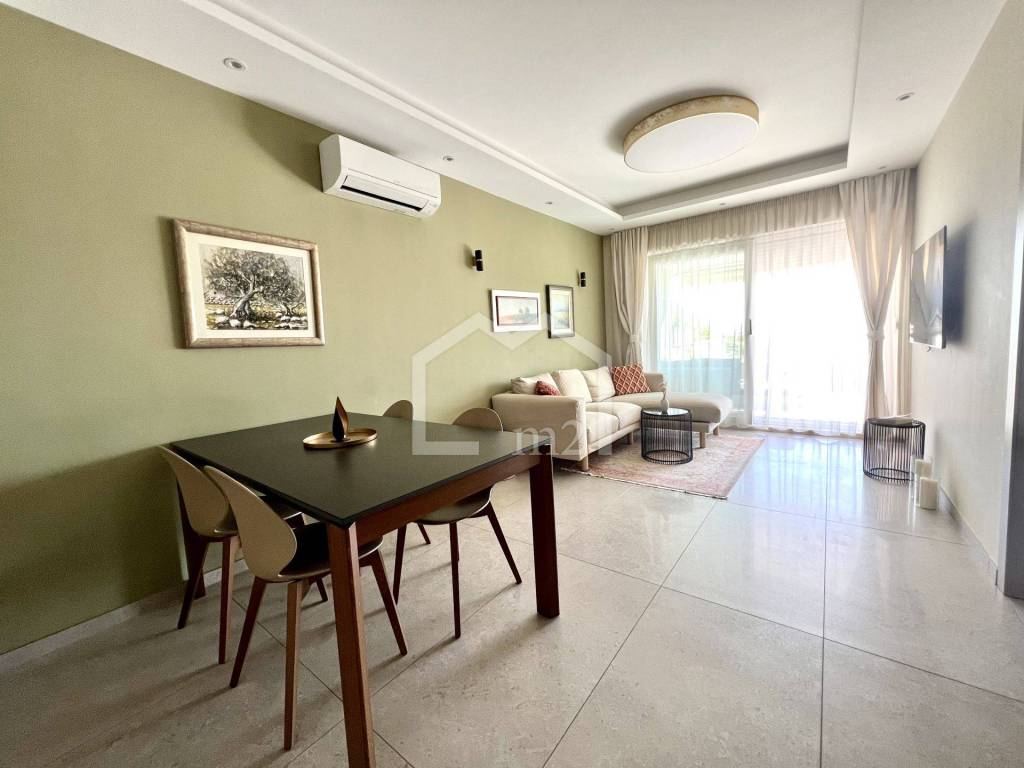 The area of the closed part of the apartment (two rooms, bathroom, kitchen, hallway and living room) is 53.94 m2. The area of the outside part (loggia and garden) is 25.50 m2. Which is a total of 79.44 m2 of living space. It consists of an entrance area, two bedrooms, a kitchen with a dining room, a living room, a bathroom and a large loggia with a jacuzzi and a view of the sea and the garden.