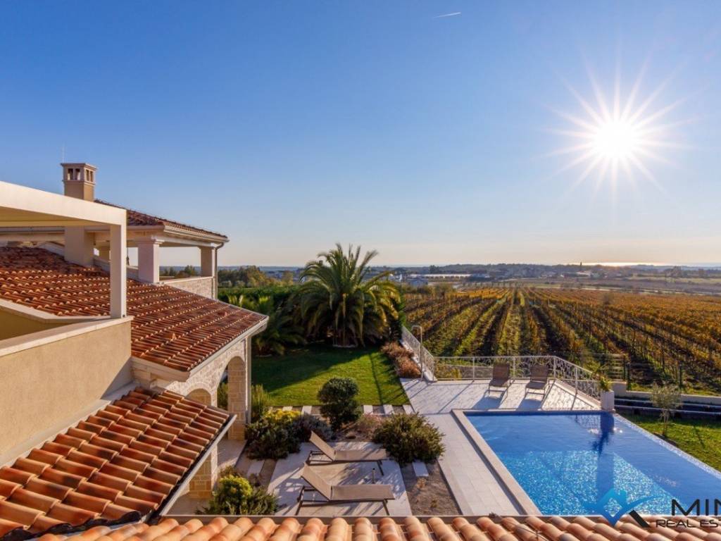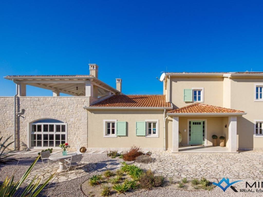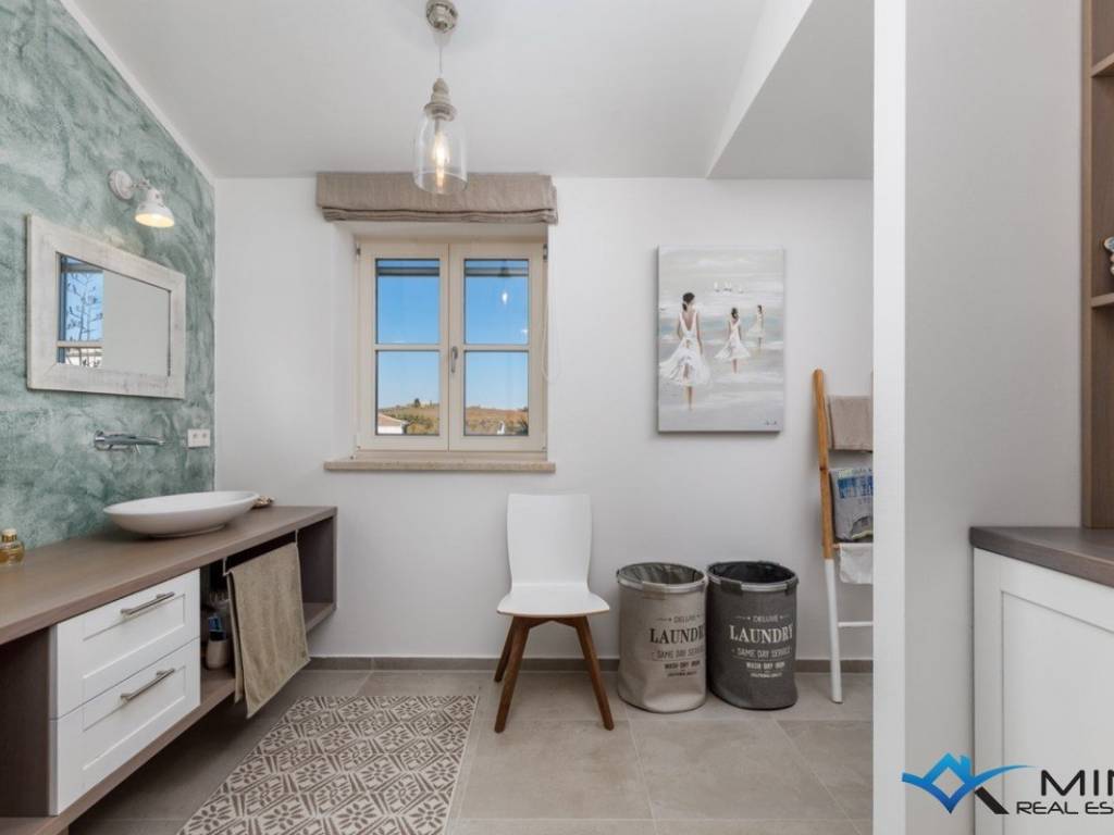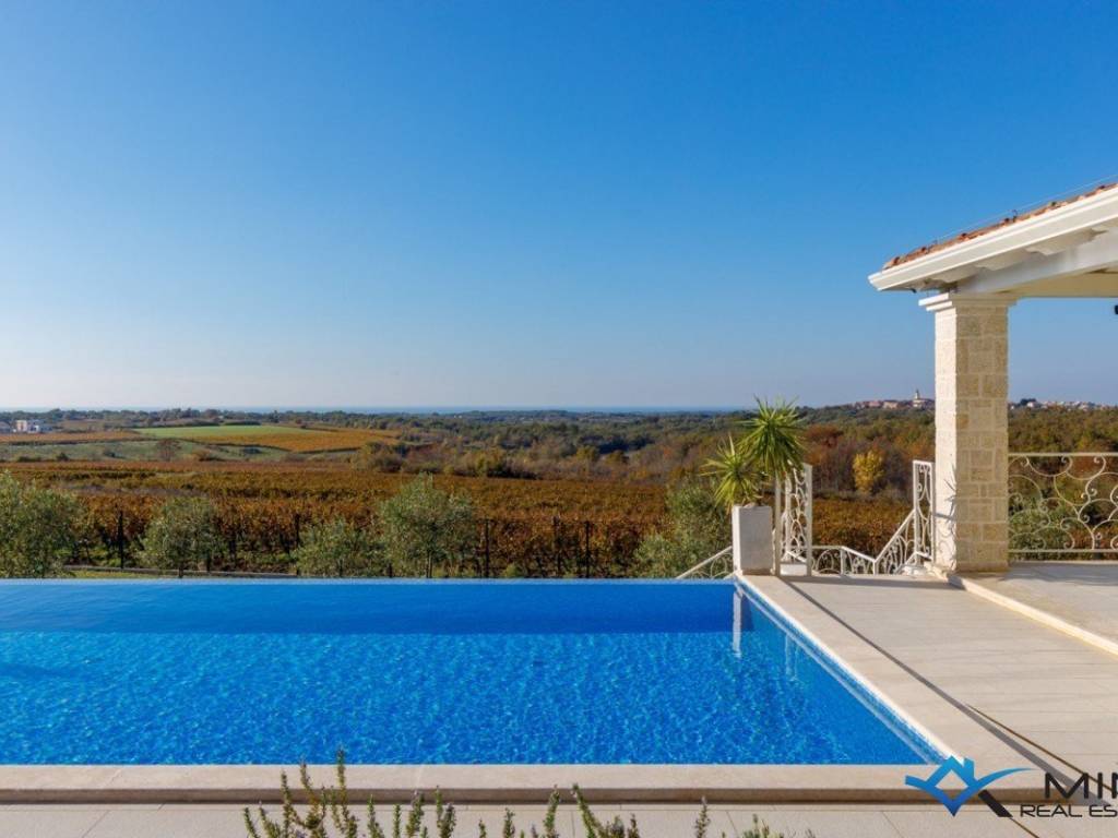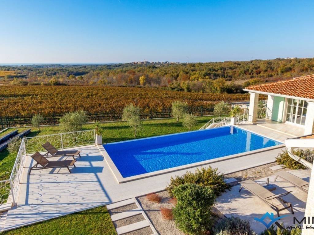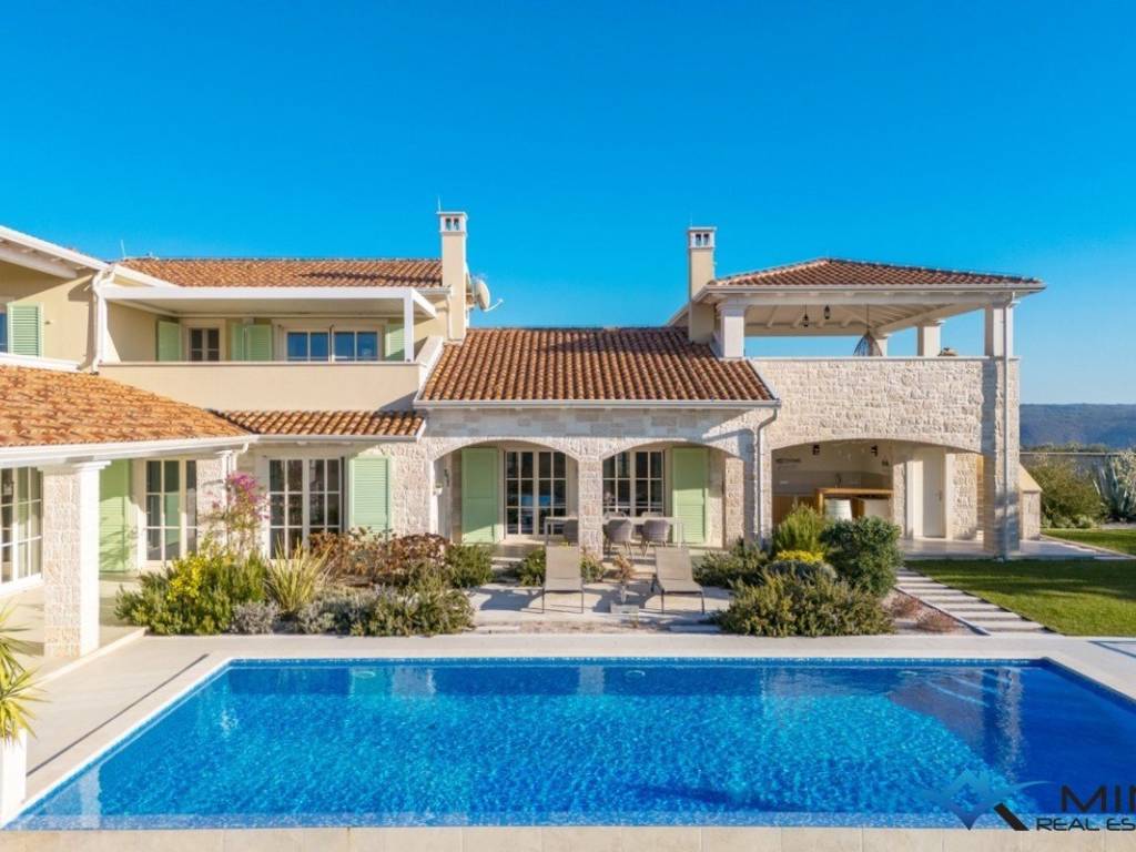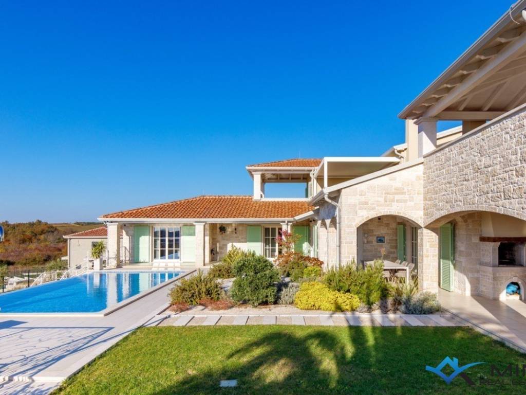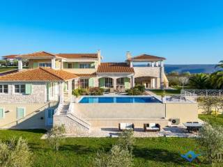 Just a few minutes drive from Novigrad, a breathtaking detached stone villa is for sale. The villa boasts 420 m, divided across three floors: basement, ground floor, and first floor, and sits on a spacious plot of 2,722 m, offering complete privacy and tranquillity. The basement features a 39 m storage area that can also be used as a garage. The ground floor comprises a hallway (an elegant entrance area with traditional Istrian charm), a pantry, WC, a tavern of approximately 18 m with a fireplace, a kitchen with dining area, and a 44 m living room that is spacious and bright, with high ceilings and a fireplace that creates a unique atmosphere. On the ground floor there are two bedrooms, including a master bedroom of 20 m, which is spacious and luxurious (with a private 20 m bathroom, sauna, and a 10 m walk-in wardrobe), while the second bedroom is 10 m with a private bathroom and can also be used as an office. Upstairs there are three bedrooms, two of which have private bathrooms and each their own private terrace with beautiful views of the sea and nature. Heating in the villa is via underfloor heating with a heat pump, while cooling is provided by a wall-integrated system, also powered by the heat pump. The villa is also equipped with a 3 kW photovoltaic power plant, solar collectors, and a water softening system. The grounds are beautifully landscaped, with an automated lawn irrigation system, and feature an infinity pool of around 70 m equipped with a saltwater electrolysis water treatment system, dynamic pool pump, and remote control via the internet. Near the pool there is a covered summer kitchen with a barbecue, gas hob, fridge, and sink. The sea and a beautifully maintained beach are 7 km away, while the centre of Novigrad is 8 km away.