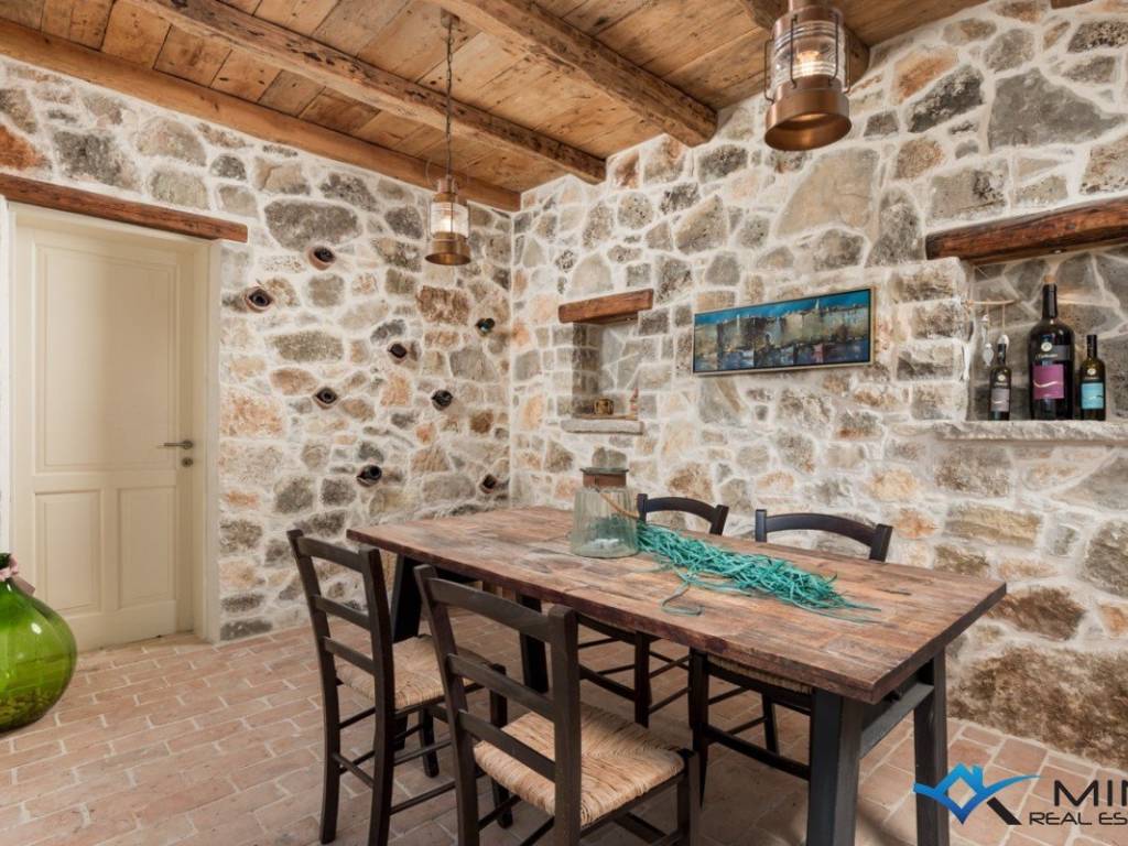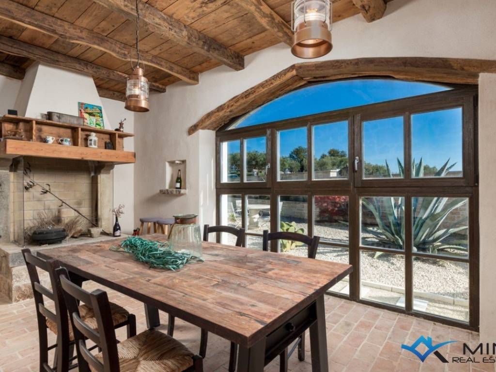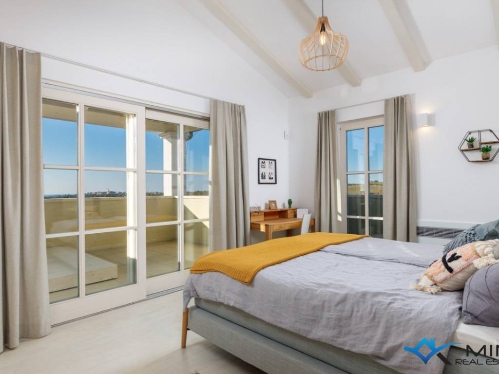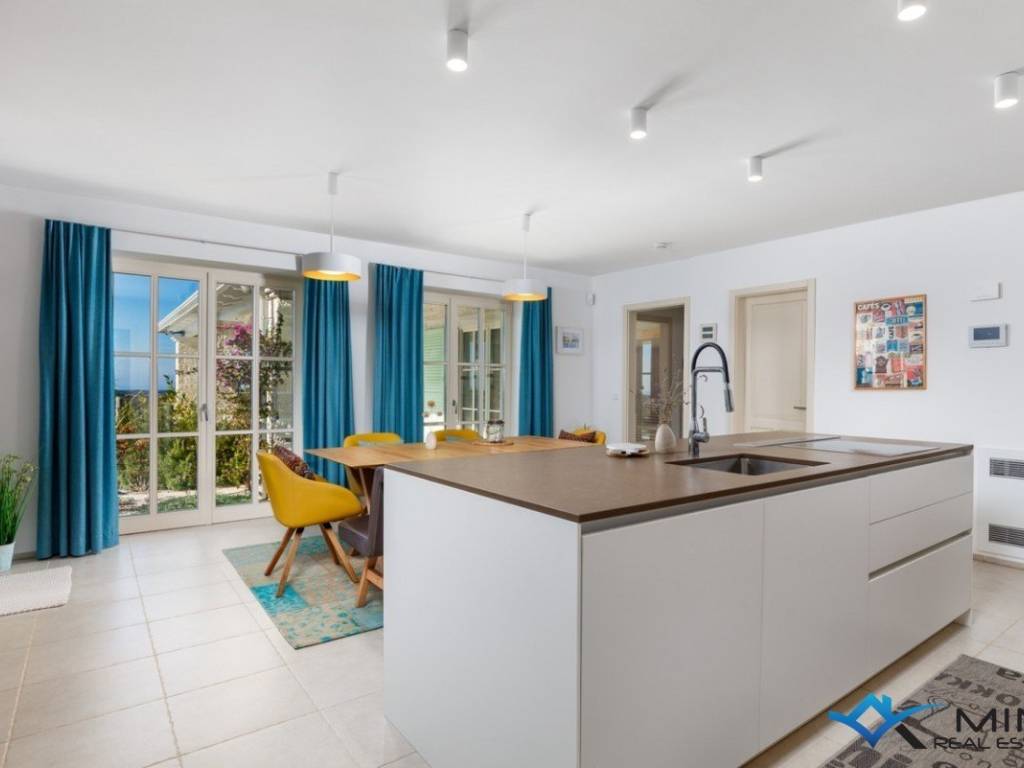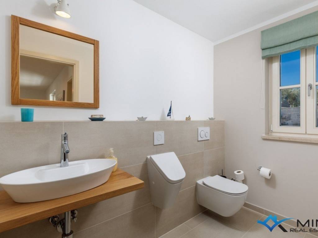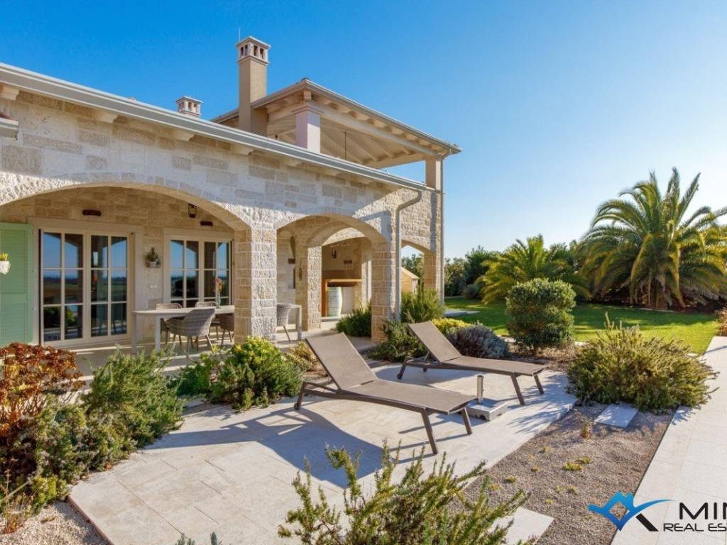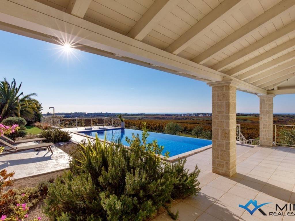 Just a few minutes drive from Novigrad, a breathtaking detached stone villa is for sale. The villa boasts 420 m, divided across three floors: basement, ground floor, and first floor, and sits on a spacious plot of 2,722 m, offering complete privacy and tranquillity. The basement features a 39 m storage area that can also be used as a garage. The ground floor comprises a hallway (an elegant entrance area with traditional Istrian charm), a pantry, WC, a tavern of approximately 18 m with a fireplace, a kitchen with dining area, and a 44 m living room that is spacious and bright, with high ceilings and a fireplace that creates a unique atmosphere. On the ground floor there are two bedrooms, including a master bedroom of 20 m, which is spacious and luxurious (with a private 20 m bathroom, sauna, and a 10 m walk-in wardrobe), while the second bedroom is 10 m with a private bathroom and can also be used as an office. Upstairs there are three bedrooms, two of which have private bathrooms and each their own private terrace with beautiful views of the sea and nature. Heating in the villa is via underfloor heating with a heat pump, while cooling is provided by a wall-integrated system, also powered by the heat pump. The villa is also equipped with a 3 kW photovoltaic power plant, solar collectors, and a water softening system. The grounds are beautifully landscaped, with an automated lawn irrigation system, and feature an infinity pool of around 70 m equipped with a saltwater electrolysis water treatment system, dynamic pool pump, and remote control via the internet. Near the pool there is a covered summer kitchen with a barbecue, gas hob, fridge, and sink. The sea and a beautifully maintained beach are 7 km away, while the centre of Novigrad is 8 km away.