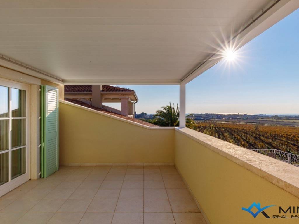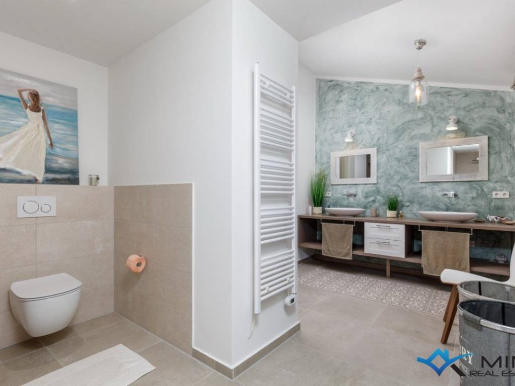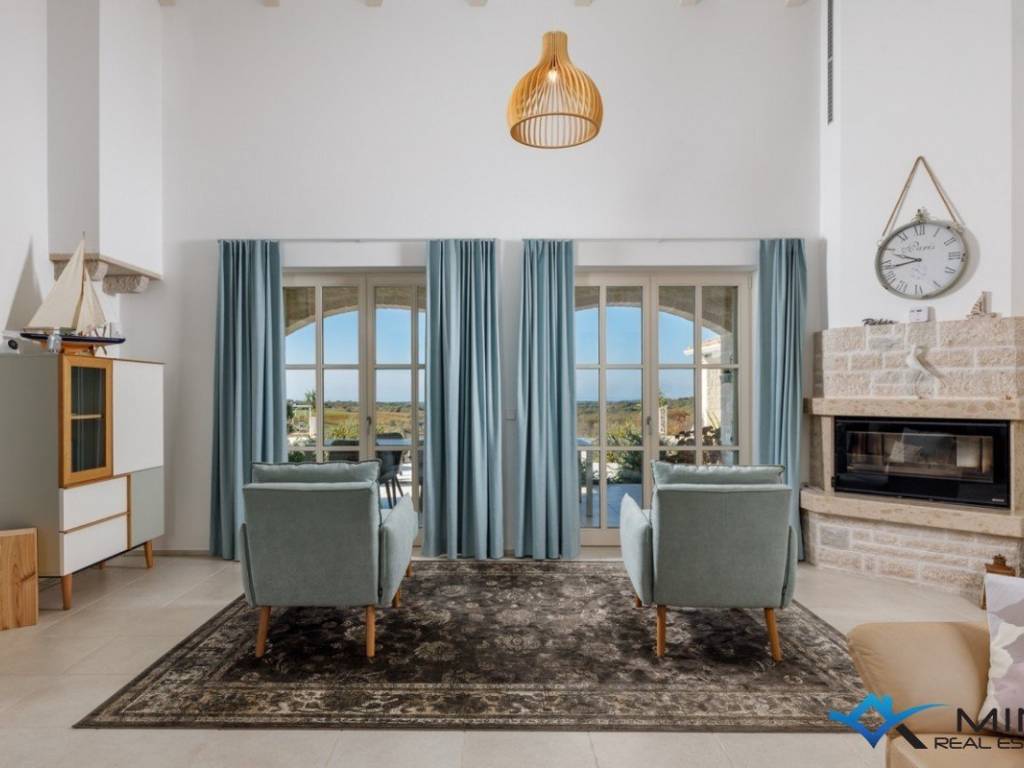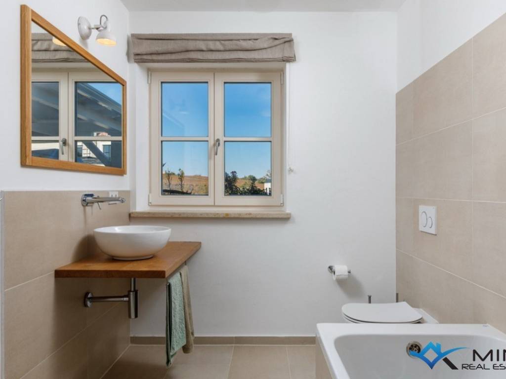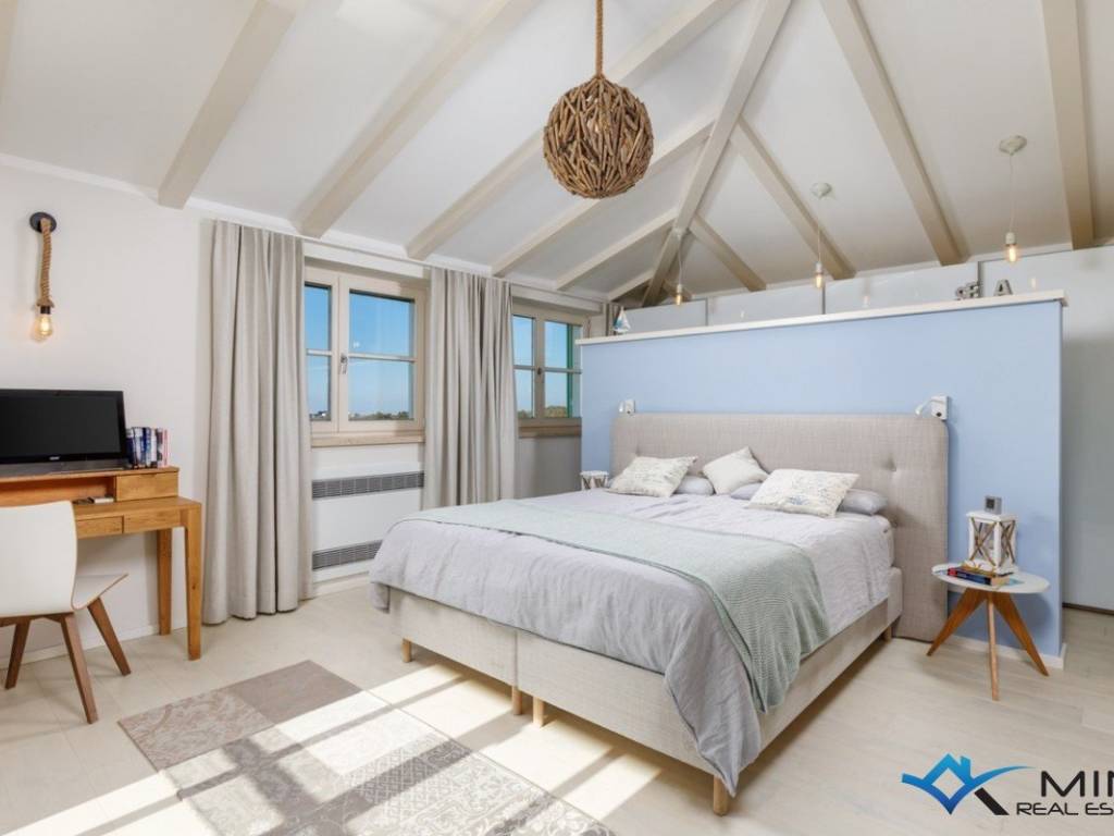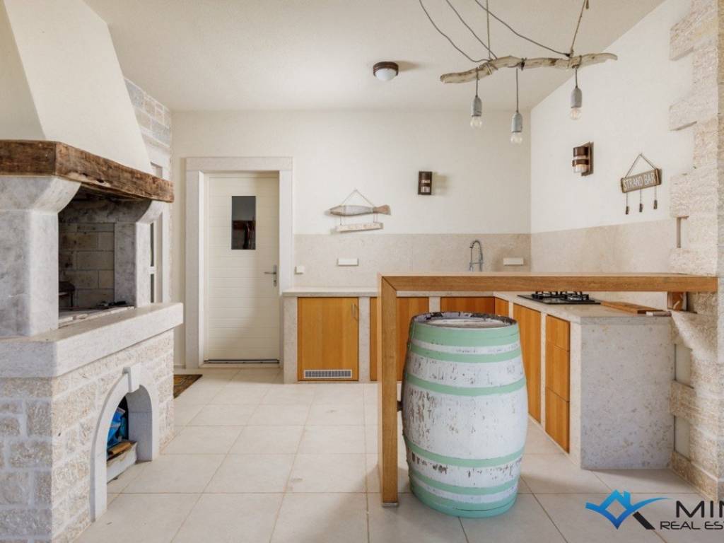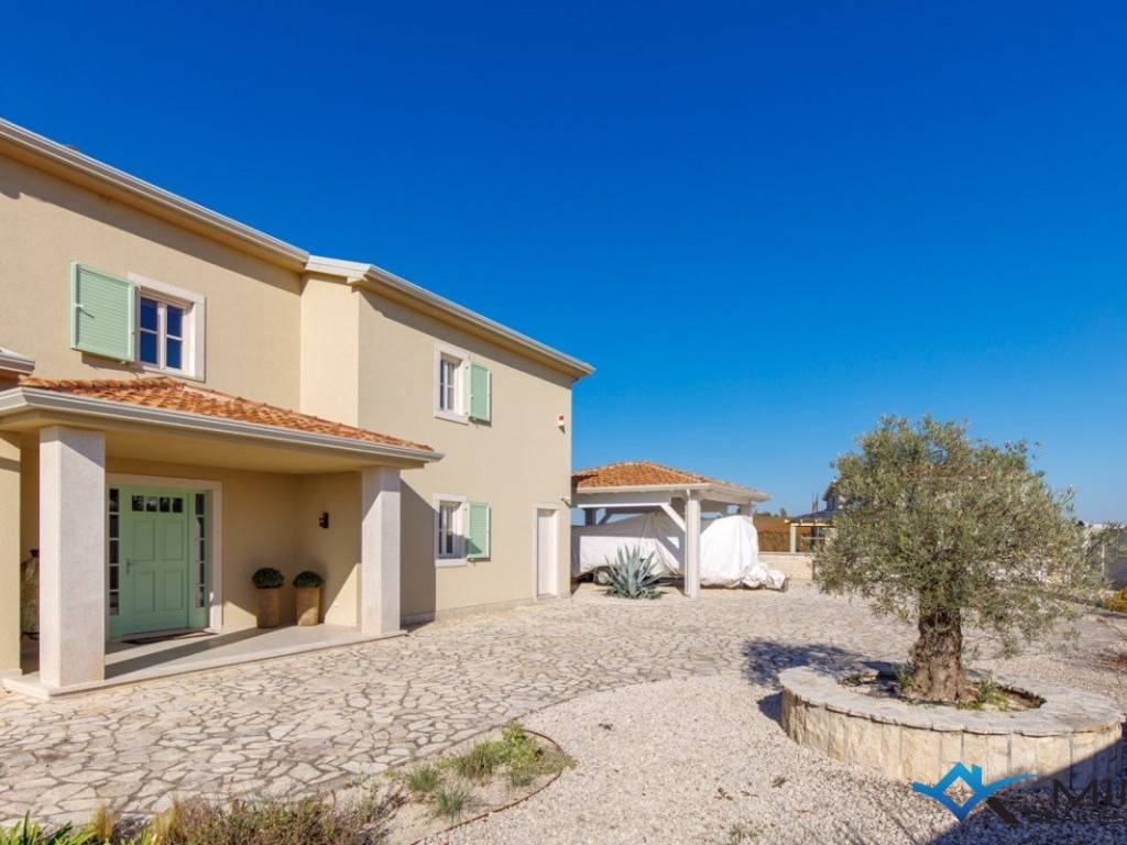 Just a few minutes drive from Novigrad, a breathtaking detached stone villa is for sale. The villa boasts 420 m, divided across three floors: basement, ground floor, and first floor, and sits on a spacious plot of 2,722 m, offering complete privacy and tranquillity. The basement features a 39 m storage area that can also be used as a garage. The ground floor comprises a hallway (an elegant entrance area with traditional Istrian charm), a pantry, WC, a tavern of approximately 18 m with a fireplace, a kitchen with dining area, and a 44 m living room that is spacious and bright, with high ceilings and a fireplace that creates a unique atmosphere. On the ground floor there are two bedrooms, including a master bedroom of 20 m, which is spacious and luxurious (with a private 20 m bathroom, sauna, and a 10 m walk-in wardrobe), while the second bedroom is 10 m with a private bathroom and can also be used as an office. Upstairs there are three bedrooms, two of which have private bathrooms and each their own private terrace with beautiful views of the sea and nature. Heating in the villa is via underfloor heating with a heat pump, while cooling is provided by a wall-integrated system, also powered by the heat pump. The villa is also equipped with a 3 kW photovoltaic power plant, solar collectors, and a water softening system. The grounds are beautifully landscaped, with an automated lawn irrigation system, and feature an infinity pool of around 70 m equipped with a saltwater electrolysis water treatment system, dynamic pool pump, and remote control via the internet. Near the pool there is a covered summer kitchen with a barbecue, gas hob, fridge, and sink. The sea and a beautifully maintained beach are 7 km away, while the centre of Novigrad is 8 km away.