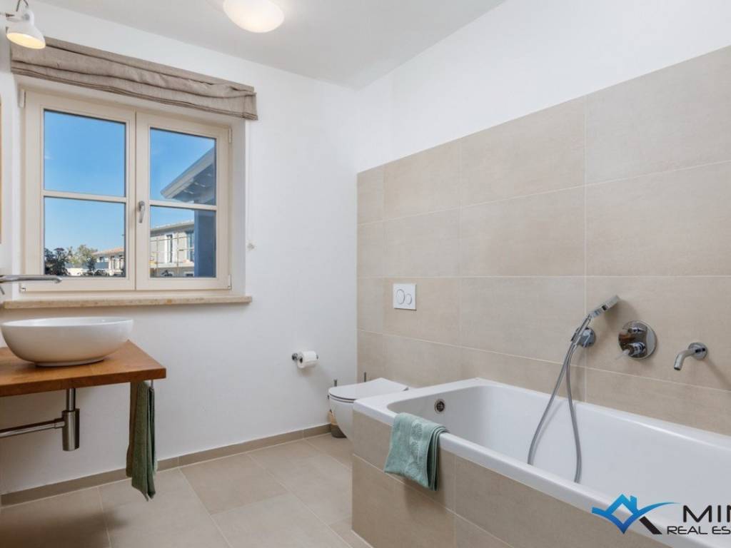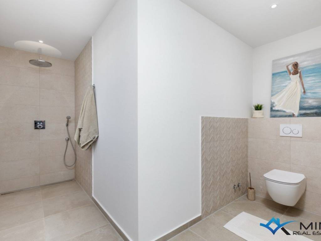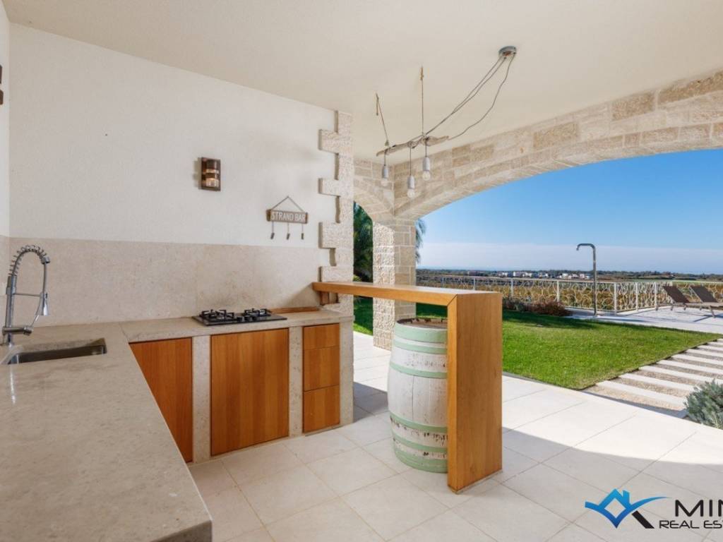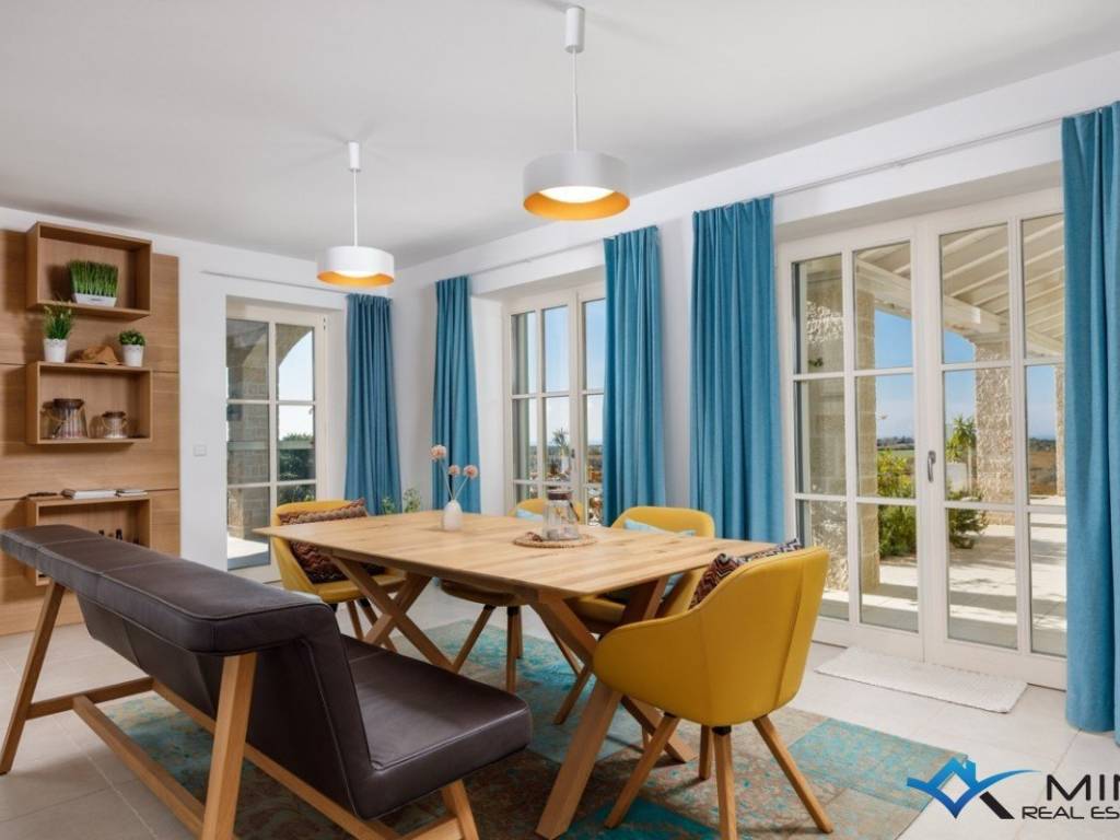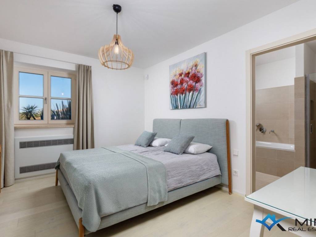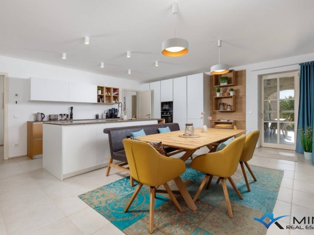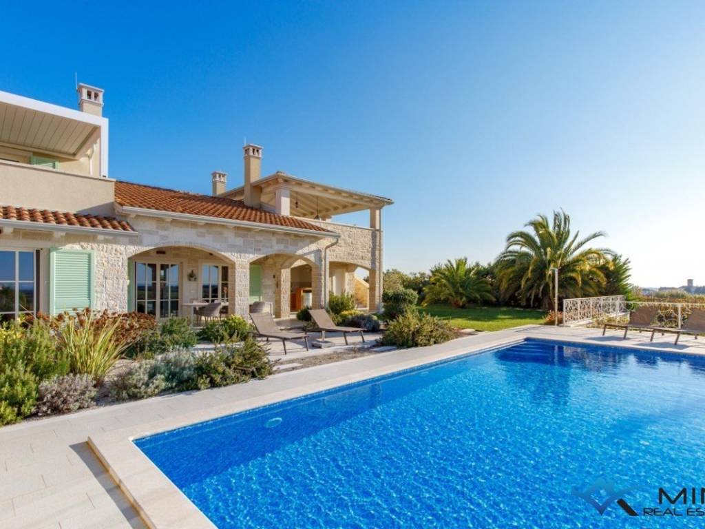 Just a few minutes drive from Novigrad, a breathtaking detached stone villa is for sale. The villa boasts 420 m, divided across three floors: basement, ground floor, and first floor, and sits on a spacious plot of 2,722 m, offering complete privacy and tranquillity. The basement features a 39 m storage area that can also be used as a garage. The ground floor comprises a hallway (an elegant entrance area with traditional Istrian charm), a pantry, WC, a tavern of approximately 18 m with a fireplace, a kitchen with dining area, and a 44 m living room that is spacious and bright, with high ceilings and a fireplace that creates a unique atmosphere. On the ground floor there are two bedrooms, including a master bedroom of 20 m, which is spacious and luxurious (with a private 20 m bathroom, sauna, and a 10 m walk-in wardrobe), while the second bedroom is 10 m with a private bathroom and can also be used as an office. Upstairs there are three bedrooms, two of which have private bathrooms and each their own private terrace with beautiful views of the sea and nature. Heating in the villa is via underfloor heating with a heat pump, while cooling is provided by a wall-integrated system, also powered by the heat pump. The villa is also equipped with a 3 kW photovoltaic power plant, solar collectors, and a water softening system. The grounds are beautifully landscaped, with an automated lawn irrigation system, and feature an infinity pool of around 70 m equipped with a saltwater electrolysis water treatment system, dynamic pool pump, and remote control via the internet. Near the pool there is a covered summer kitchen with a barbecue, gas hob, fridge, and sink. The sea and a beautifully maintained beach are 7 km away, while the centre of Novigrad is 8 km away.