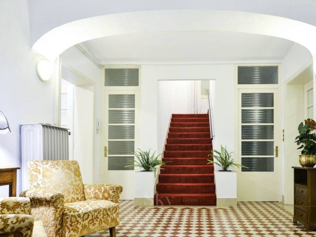 The apartment spans two levels. The first level includes a grand atrium, a spacious kitchen with dining area, a bathroom, and two additional storage rooms. An elegant staircase leads to the second floor, which consists of four generous rooms, two of which open onto a balcony, along with an additional bathroom.