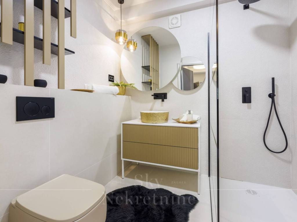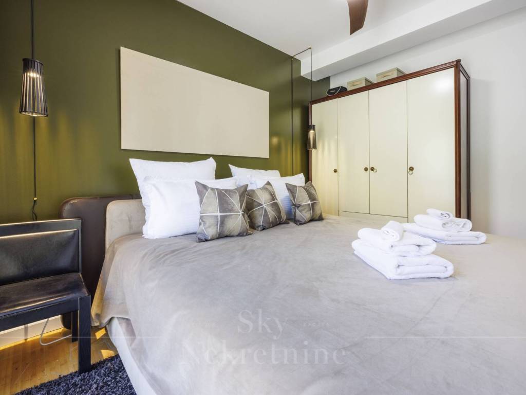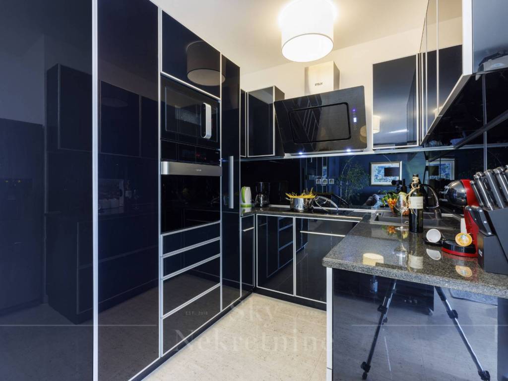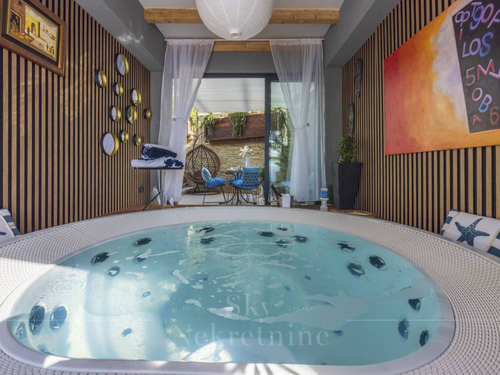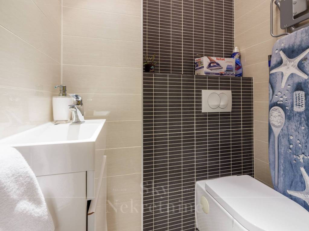 The penthouse features three bedrooms and two bathrooms—one main bathroom and a guest WC. Additionally, the apartment includes a private wellness area with a jacuzzi, as well as a social space equipped with a billiards table and a bar, making it ideal for entertainment and relaxation.