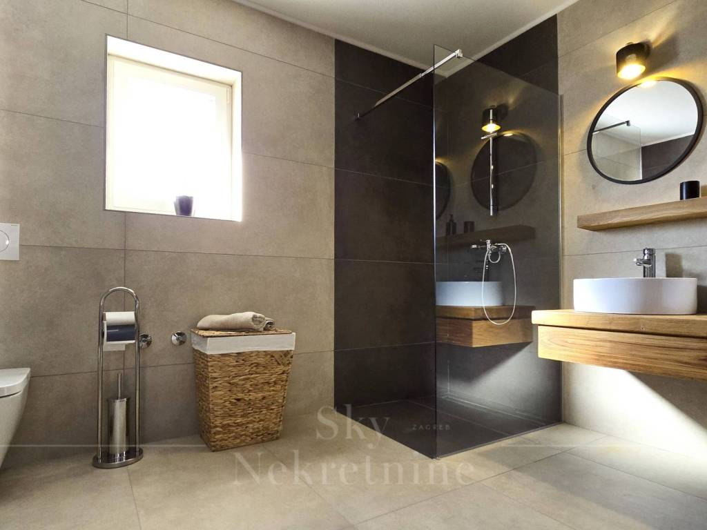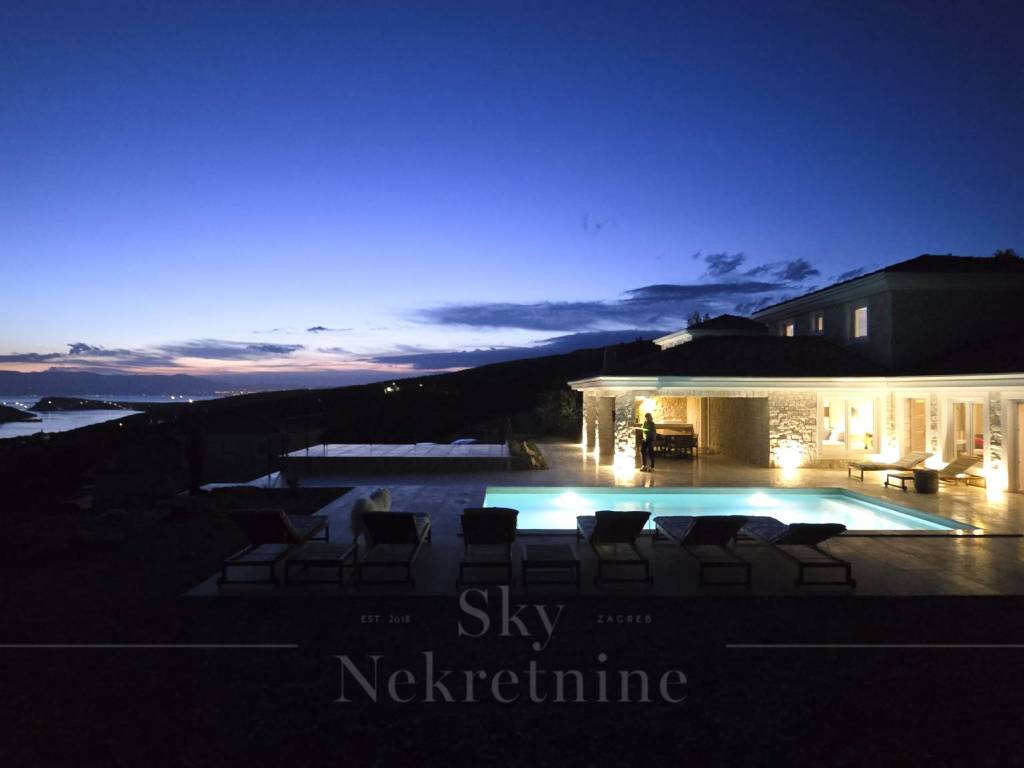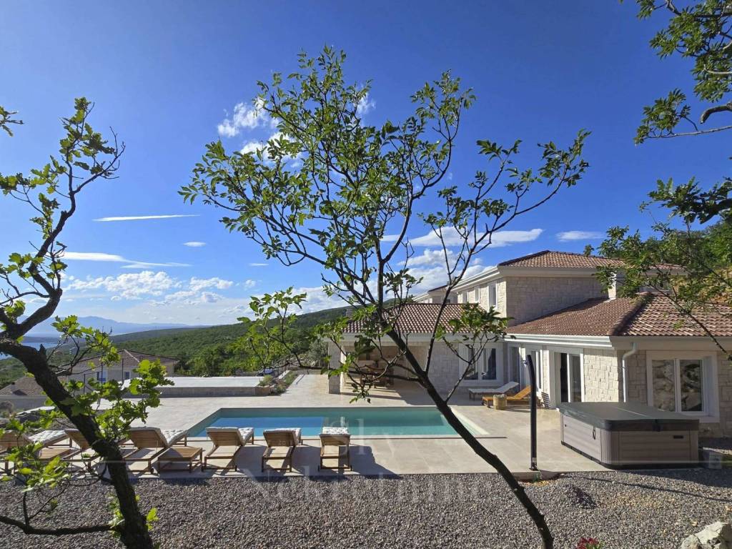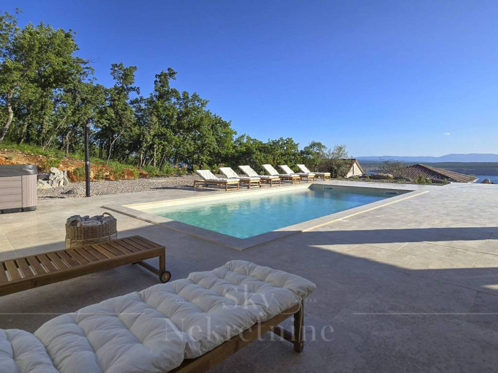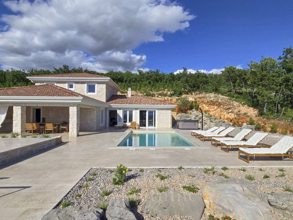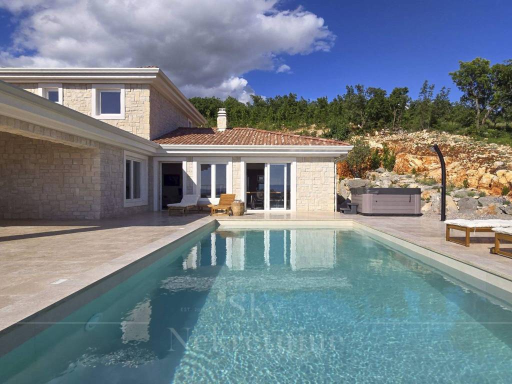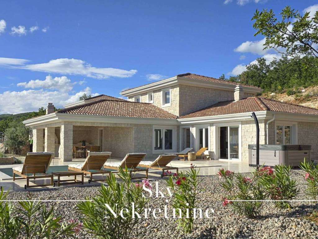 A 35 m2 swimming pool, 1.7 meters deep, with built-in heating, water electrolysis, and ceramic tiles, adds extra luxury to the villa. Alongside the pool, in the courtyard, there is a six-person outdoor hot tub, an outdoor dining table made of Slavonian oak, and an outdoor stone-built barbecue. The villa's courtyard is landscaped with authentic Mediterranean plants, olive trees, and natural rocks.