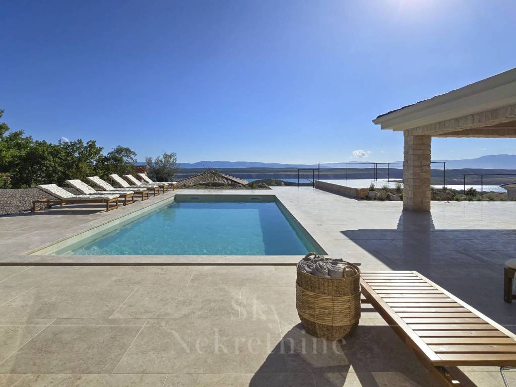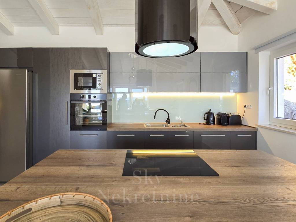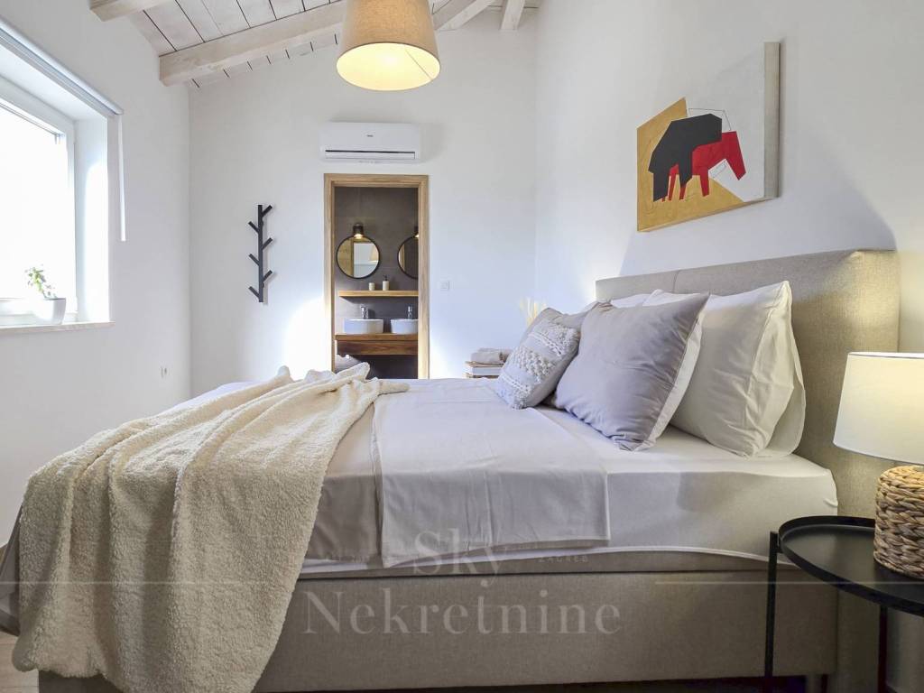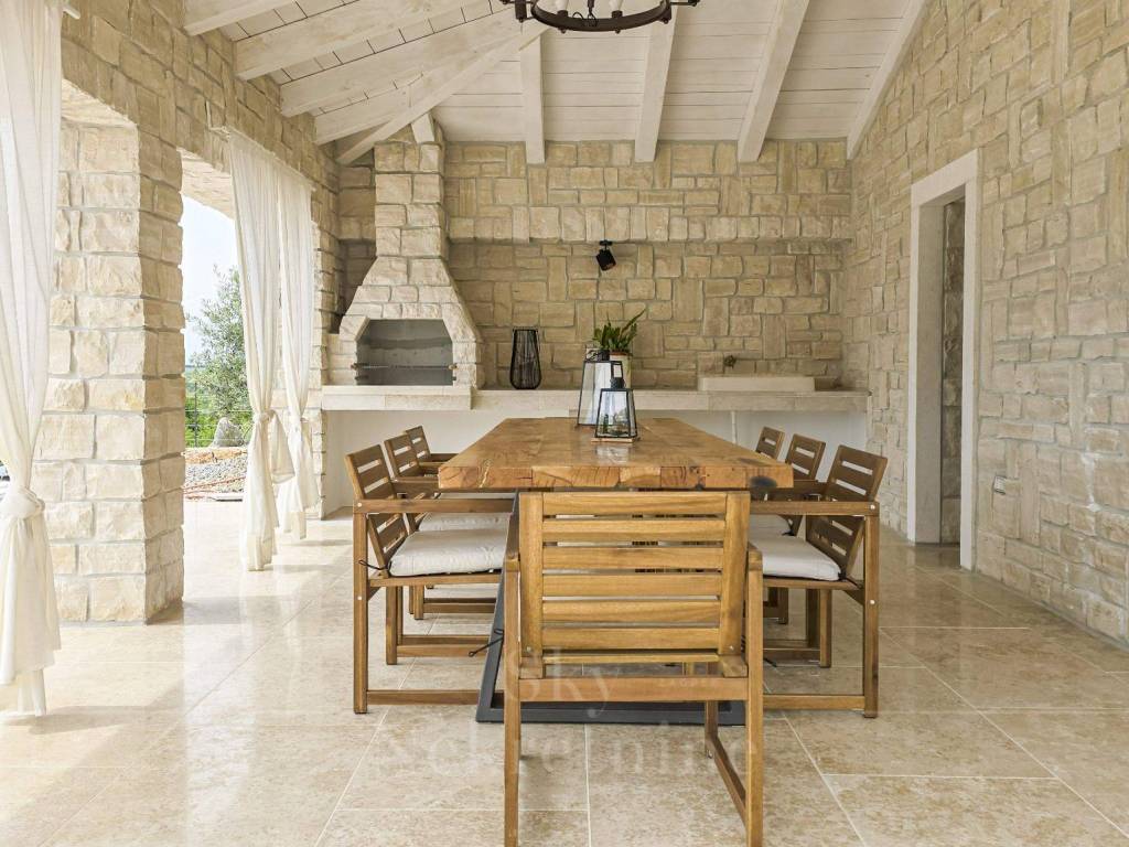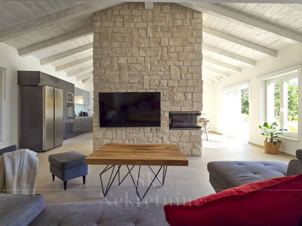 The villa has a surface area of 200 m2 and is situated on a plot of land measuring 1,200 m2. It is decorated in a rustic style and built from Istrian Kanfanar stone, representing a perfect blend of tradition and luxury.
