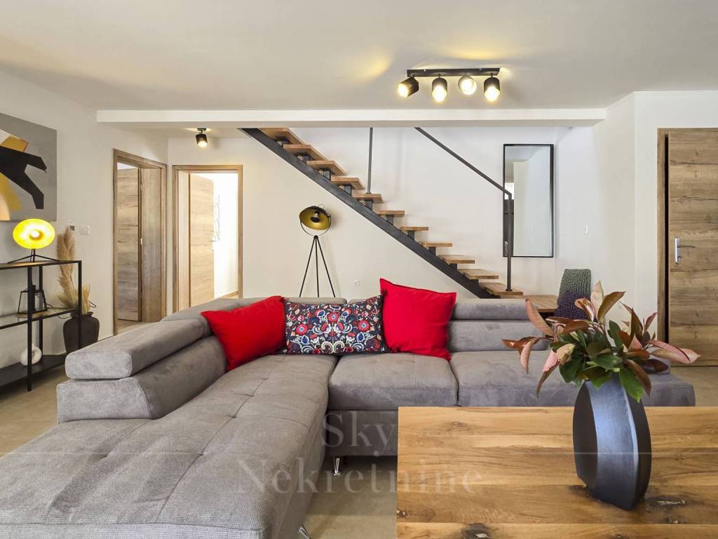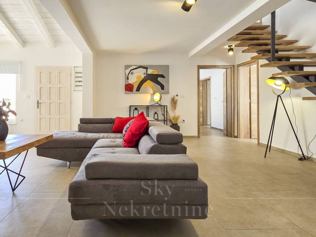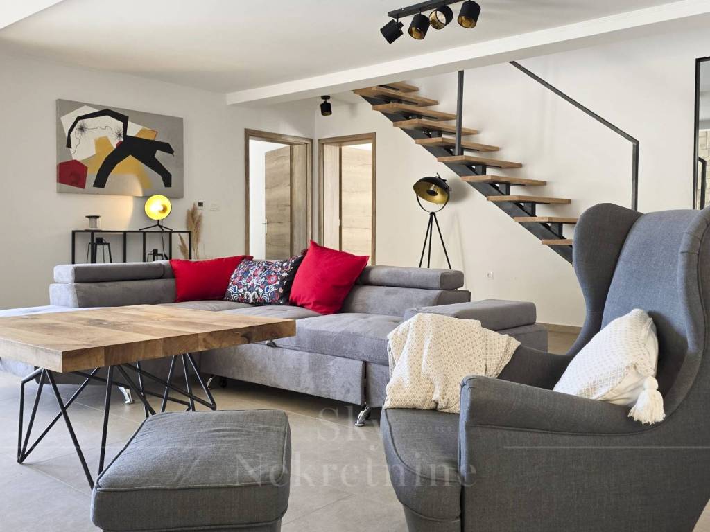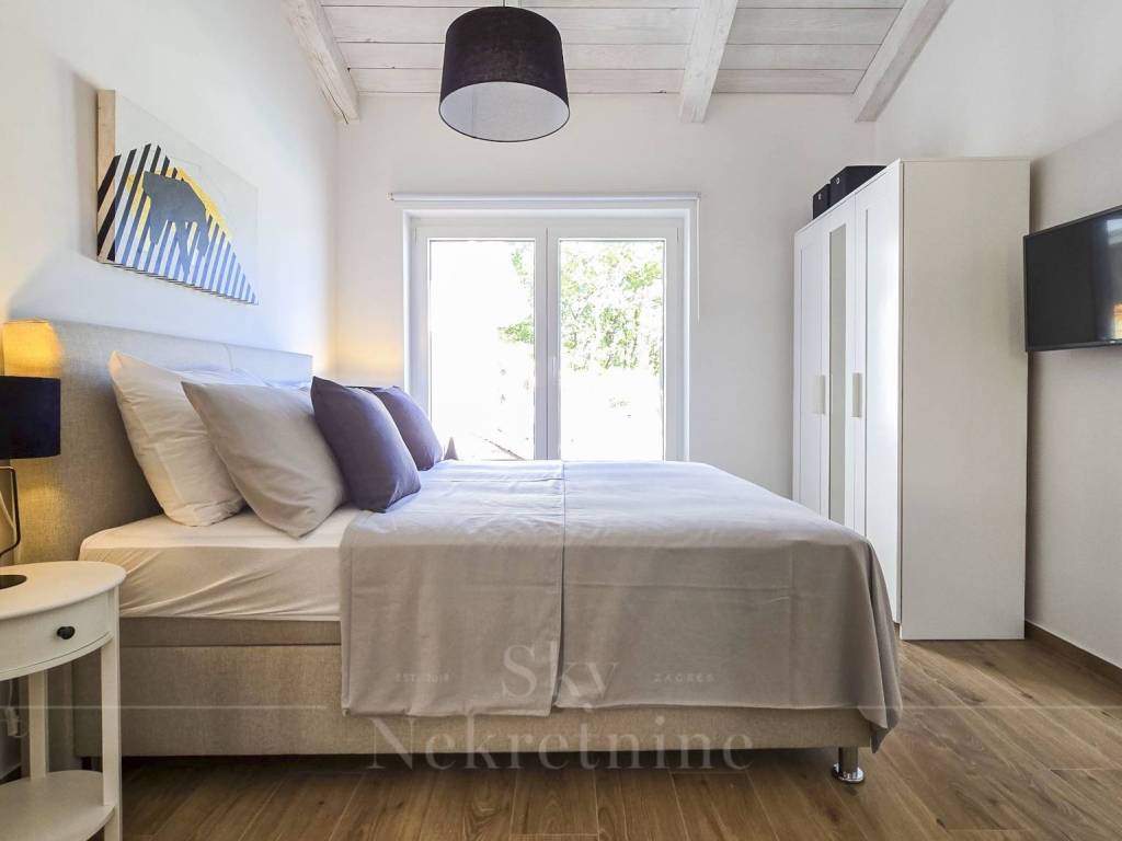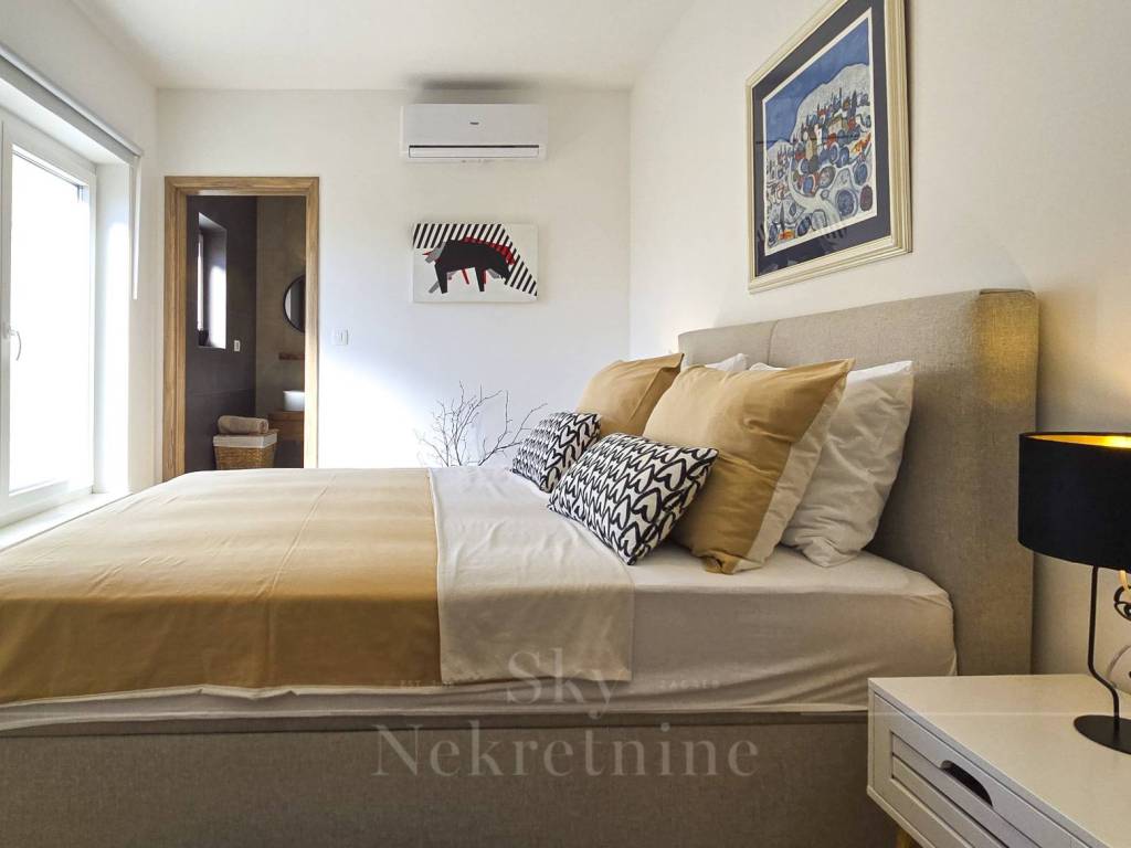 The villa has a surface area of 200 m2 and is situated on a plot of land measuring 1,200 m2. It is decorated in a rustic style and built from Istrian Kanfanar stone, representing a perfect blend of tradition and luxury.