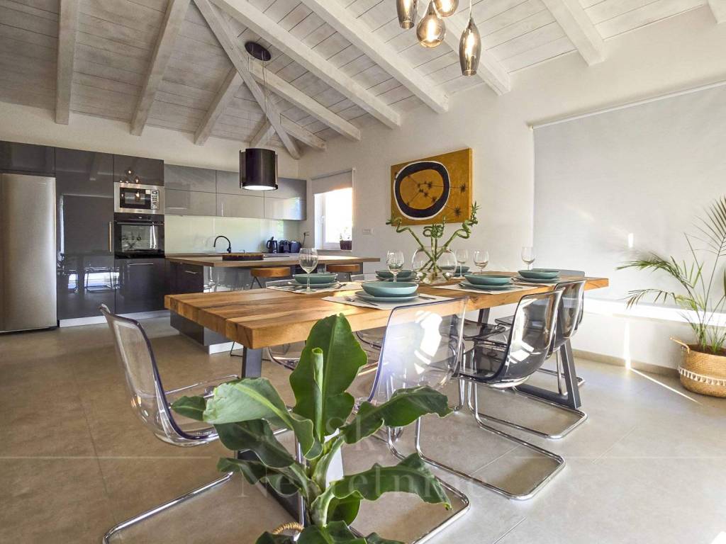 The ground floor consists of two bedrooms and an open-plan living room with a fireplace, along with a modernly equipped kitchen and dining area. On the upper floor, there are two more bedrooms with panoramic sea views. The villa comfortably accommodates eight people in four double bedrooms, each with a private bathroom equipped with a modern shower cabin.