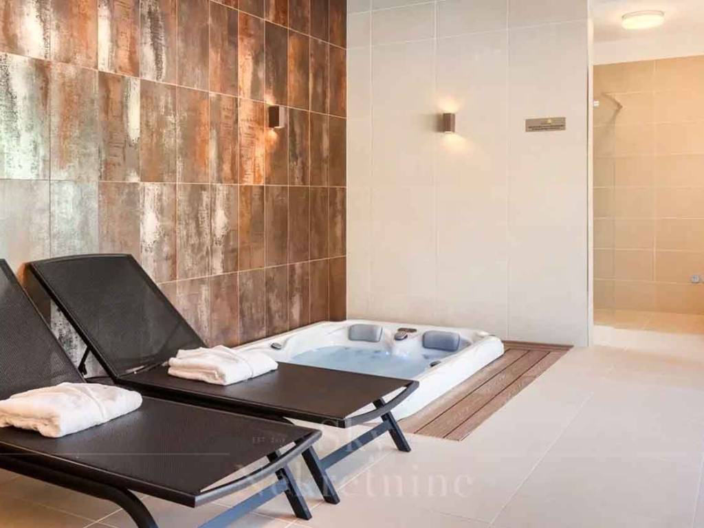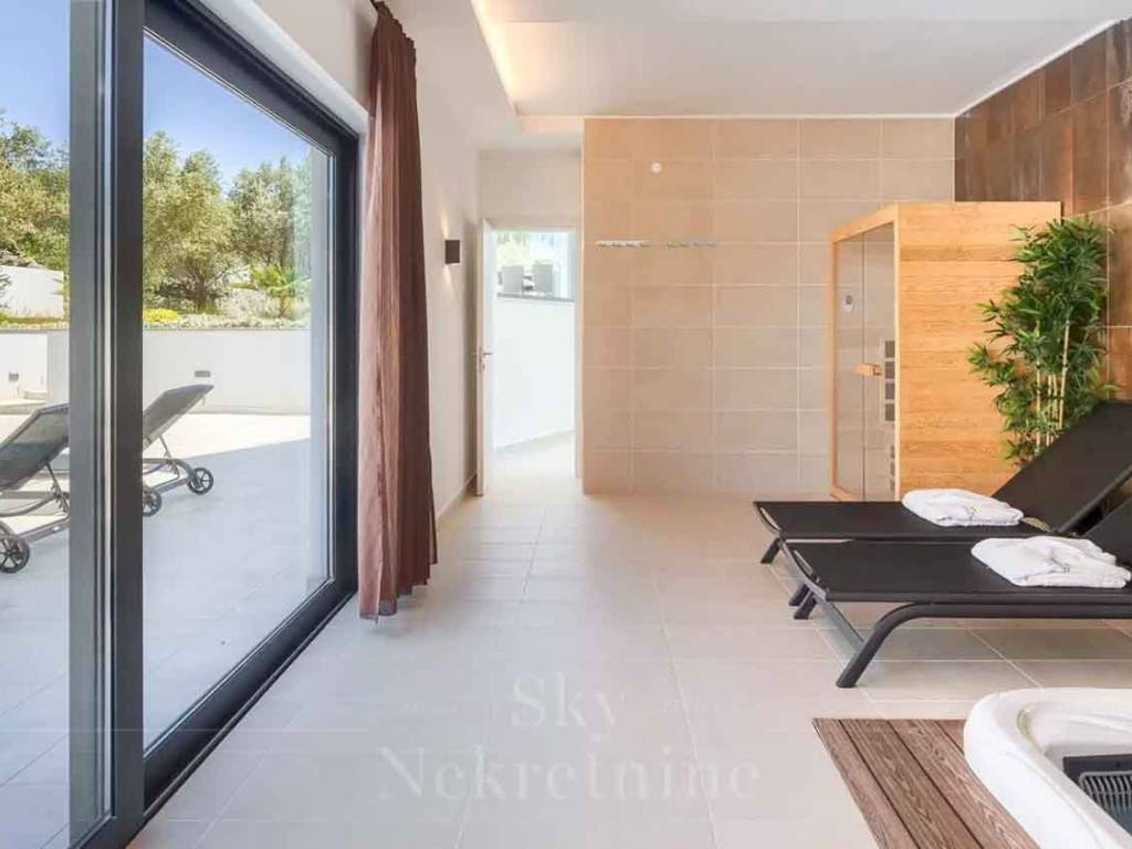 On the ground floor of the villa, there are three bedrooms, two bathrooms, a utility room, a cellar, and storage spaces. The mezzanine is reserved for a wellness center equipped with a Jacuzzi and a sauna.