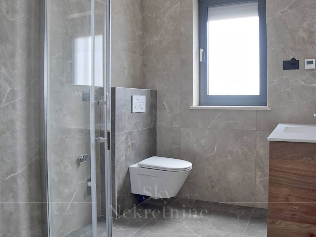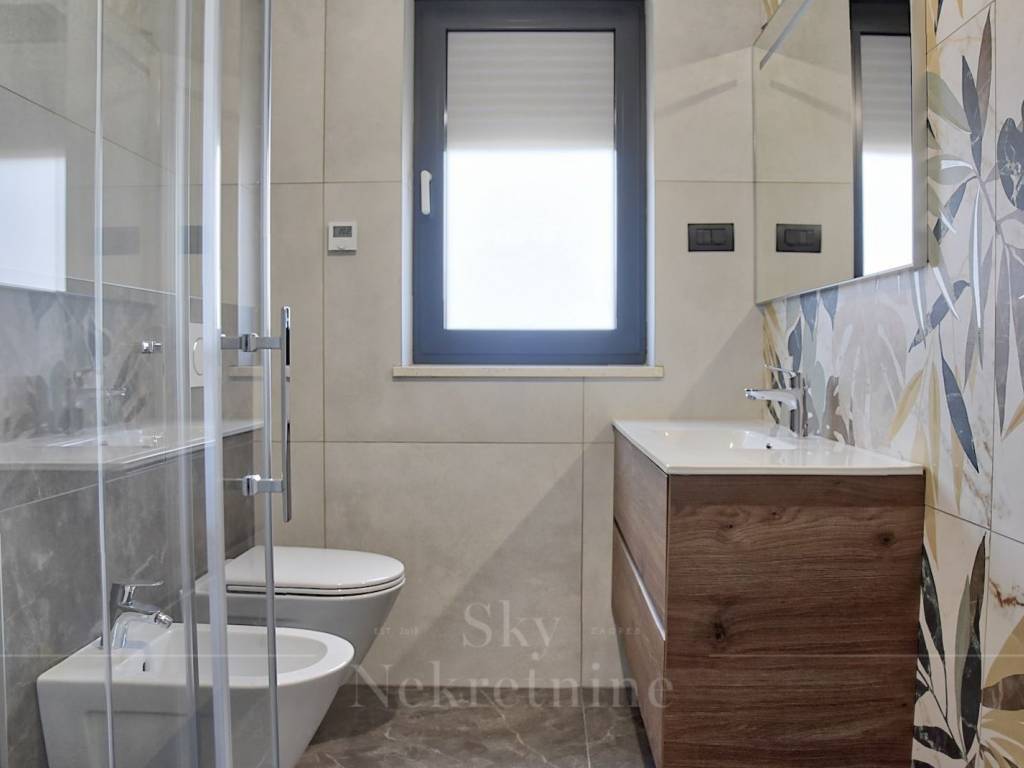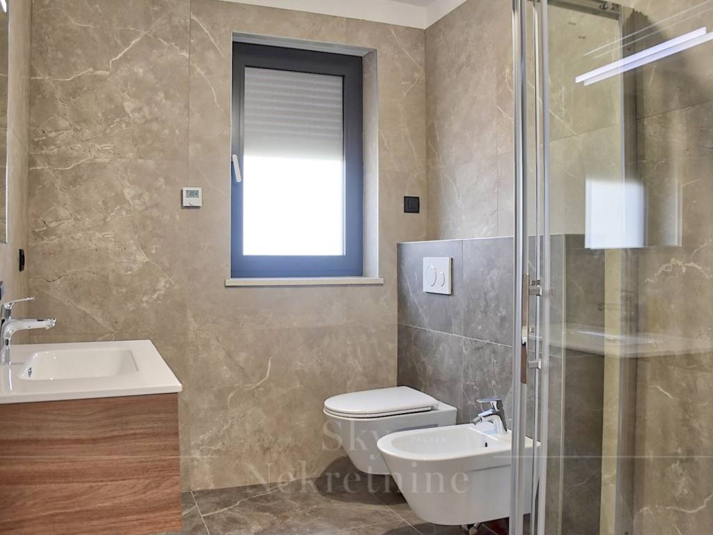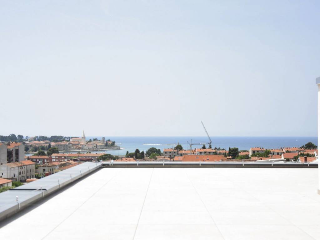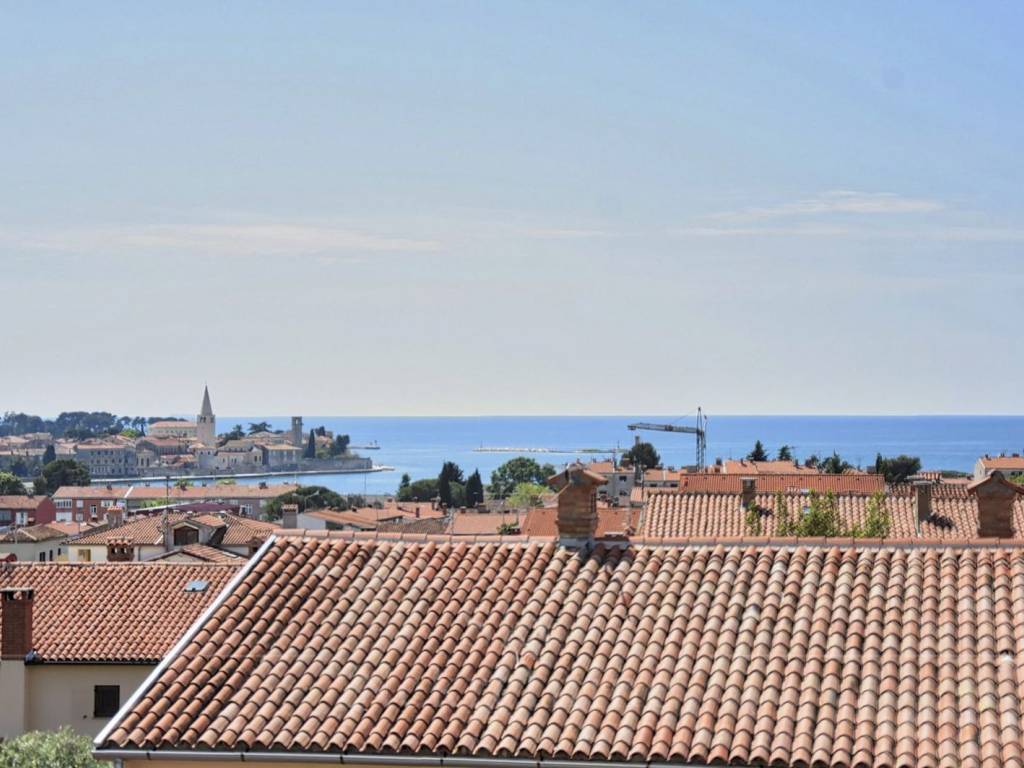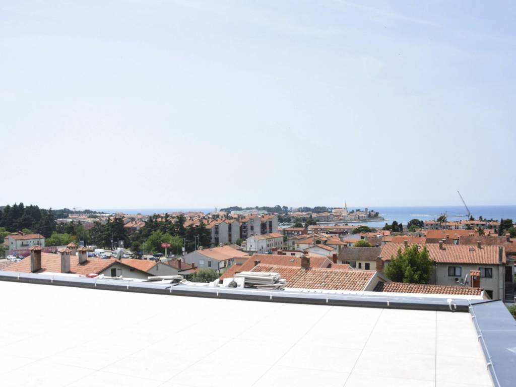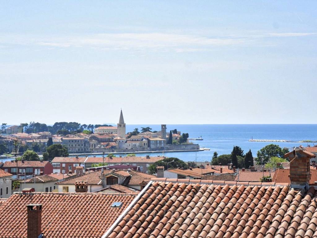The rooftop terrace boasts an open view of 180 degrees overlooking the sea and the old town of Poreč, equipped with connections for a summer kitchen, shower, and jacuzzi, creating an ideal space for relaxation and enjoyment of the stunning panorama.