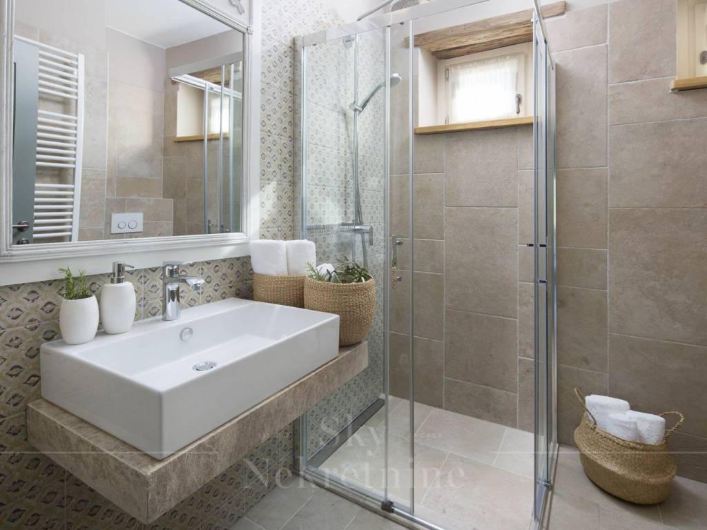 On the ground floor of the villa, there is a large room with arches separating the spacious living room, dining area, and kitchen. The ground floor also features two bedrooms, each with its private bathroom, and a guest toilet. On the first floor, there are three bedrooms, each with its private bathroom.