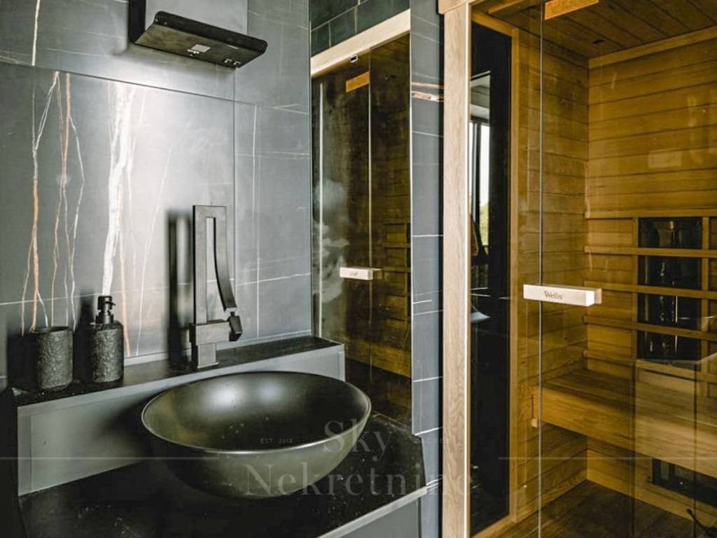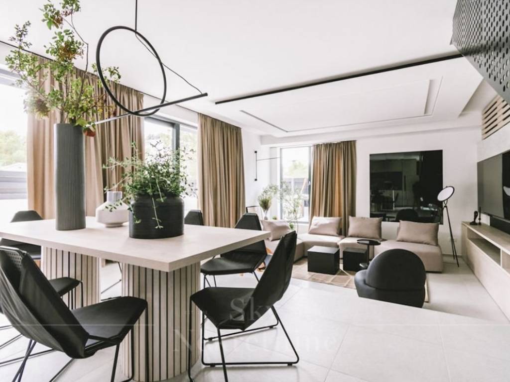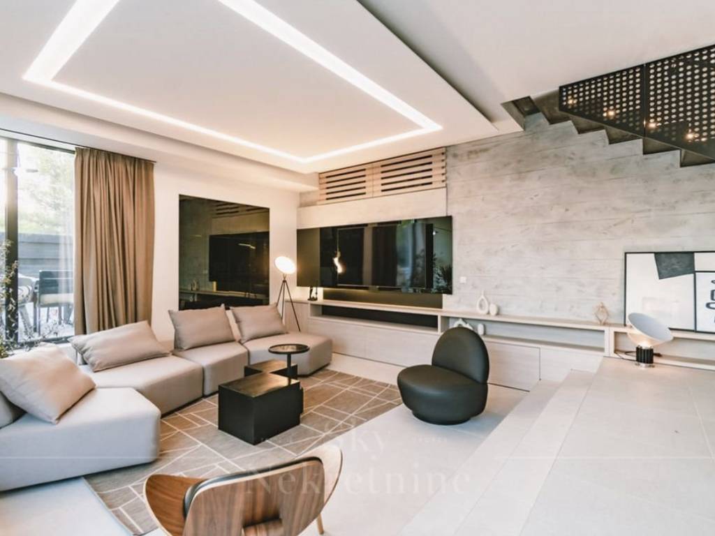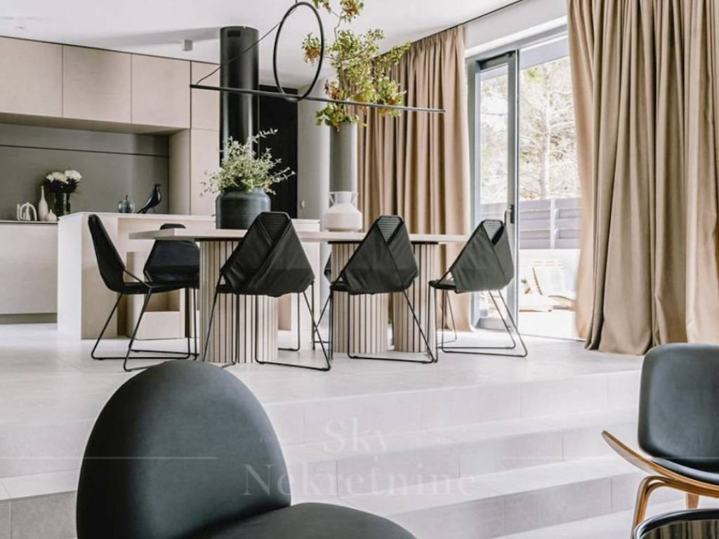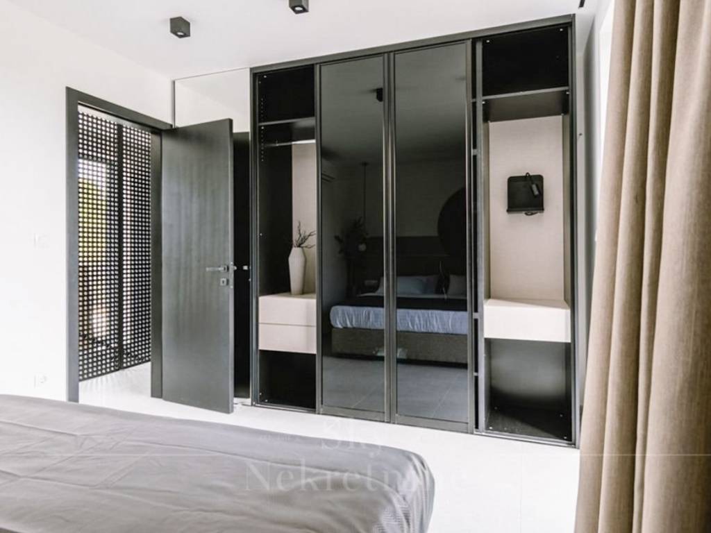 Stepping out from the living room leads to a meticulously designed courtyard, featuring distinct zones—a Mediterranean garden adorned with diverse flora, a furnished terrace, a 50 m2 pool, and a jacuzzi.