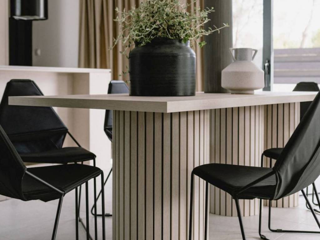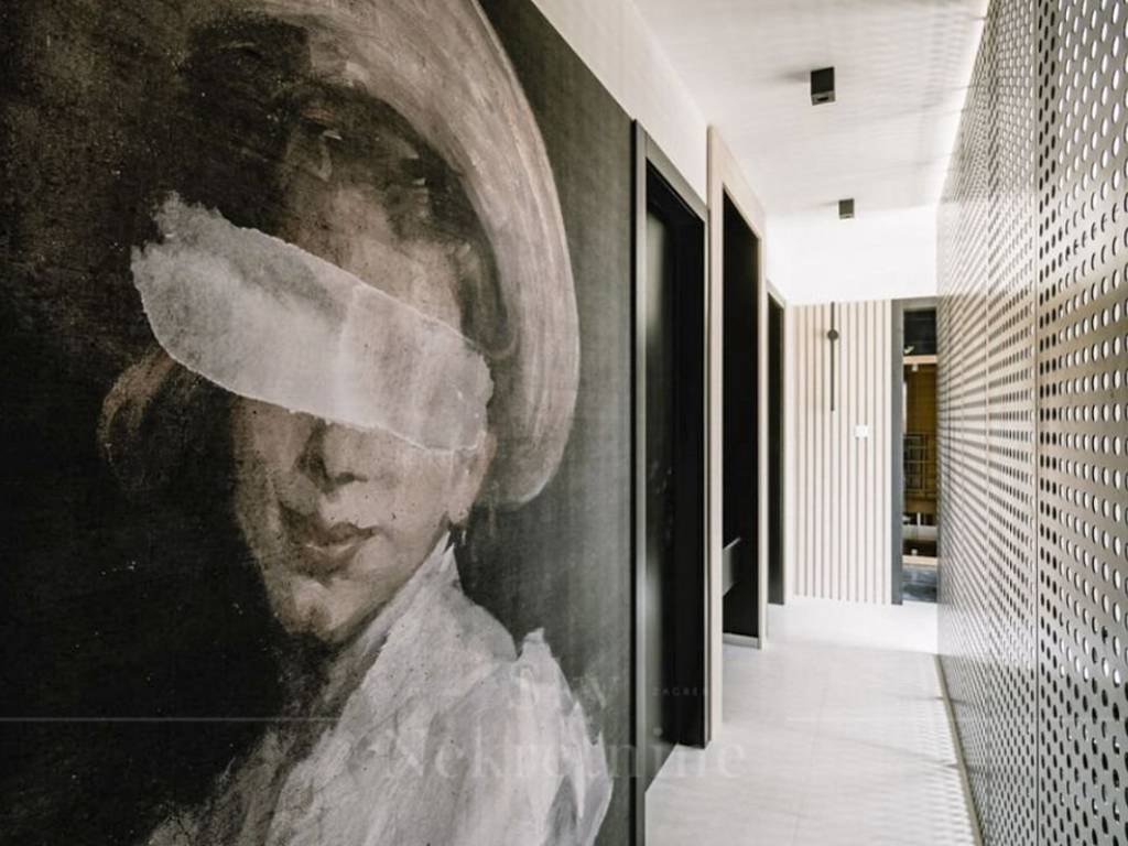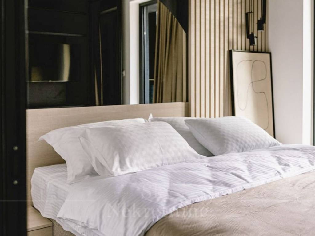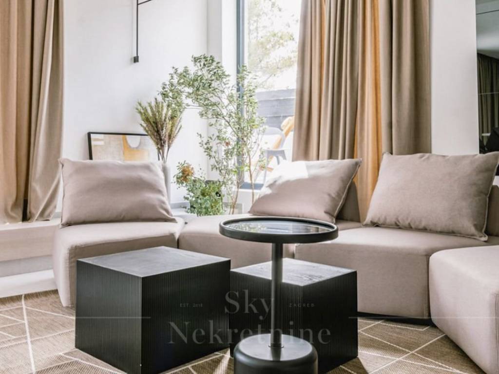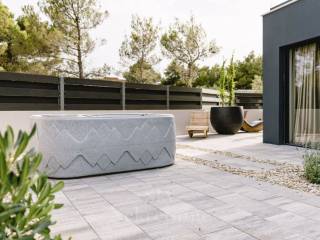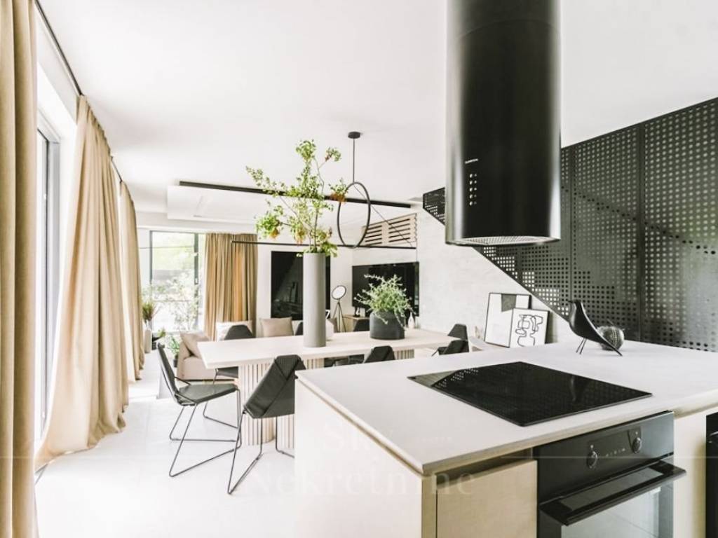 Stepping out from the living room leads to a meticulously designed courtyard, featuring distinct zones—a Mediterranean garden adorned with diverse flora, a furnished terrace, a 50 m2 pool, and a jacuzzi.