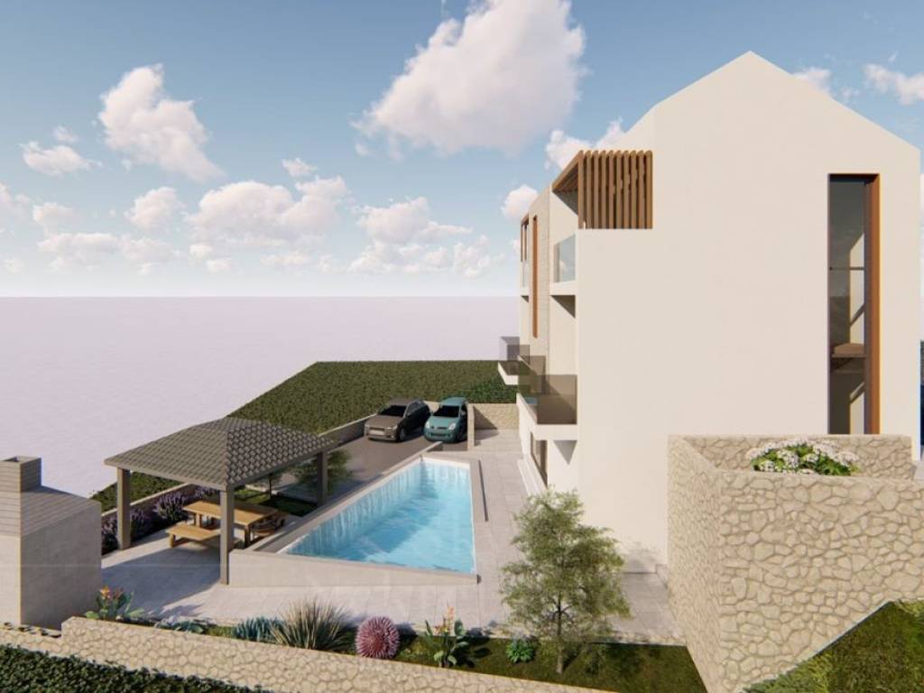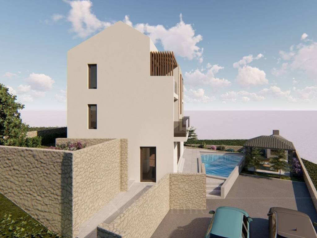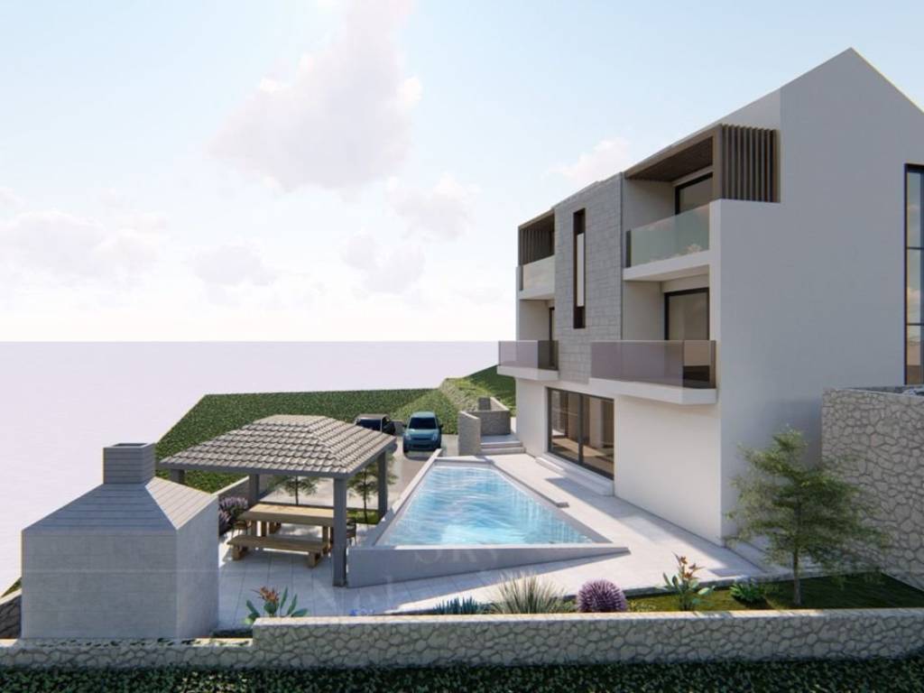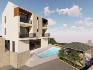 The villa is located on an elevated plot with an open view, only 70 meters from the sea and the first beach.