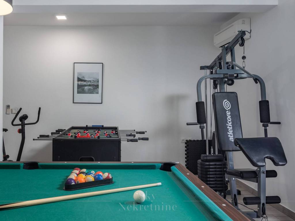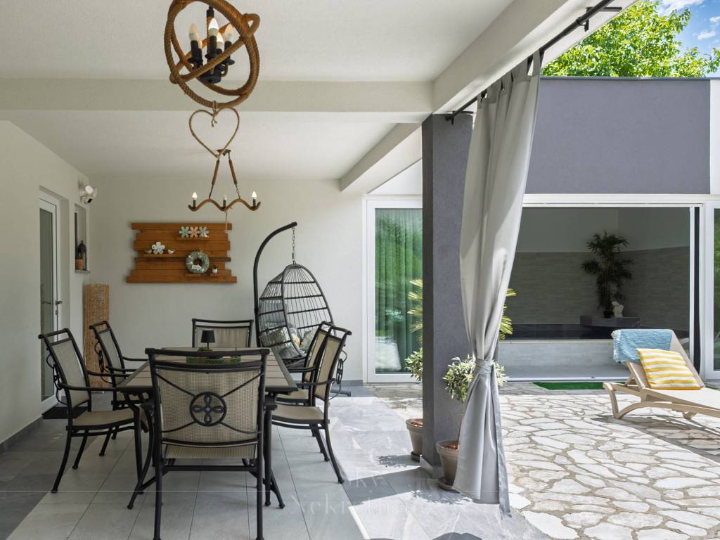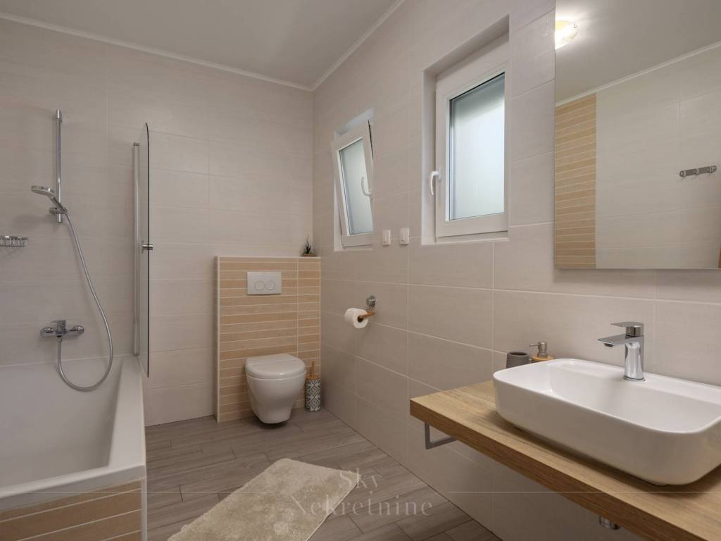 Each of the 4 bedrooms has its own bathroom with a toilet, and you can enjoy an open view from 2 balconies and a terrace. The professional construction achieved an energy certificate rating of B, while energy conservation is aided by an air-water heat pump used for heating the house and the 32m2 pool (depth 135cm). The entire house has underfloor heating, as does the pool.