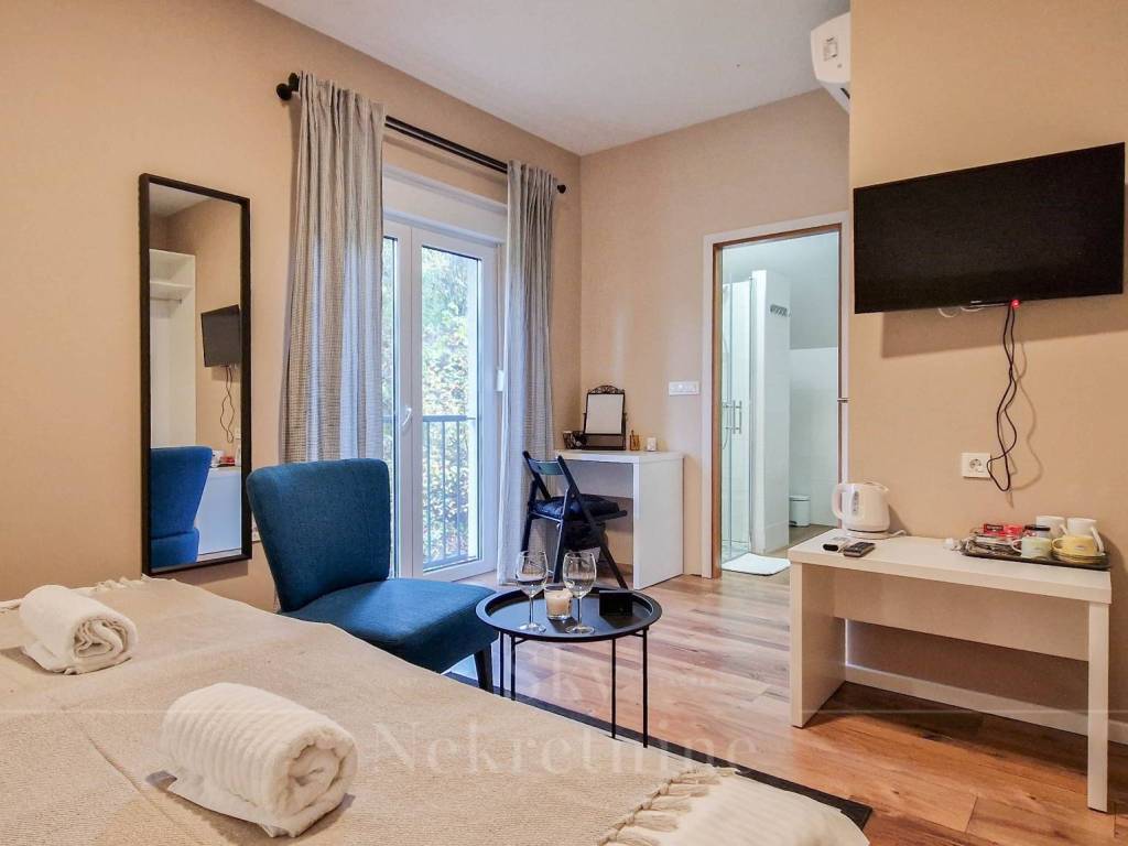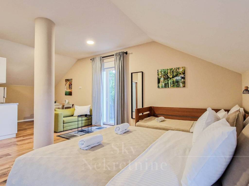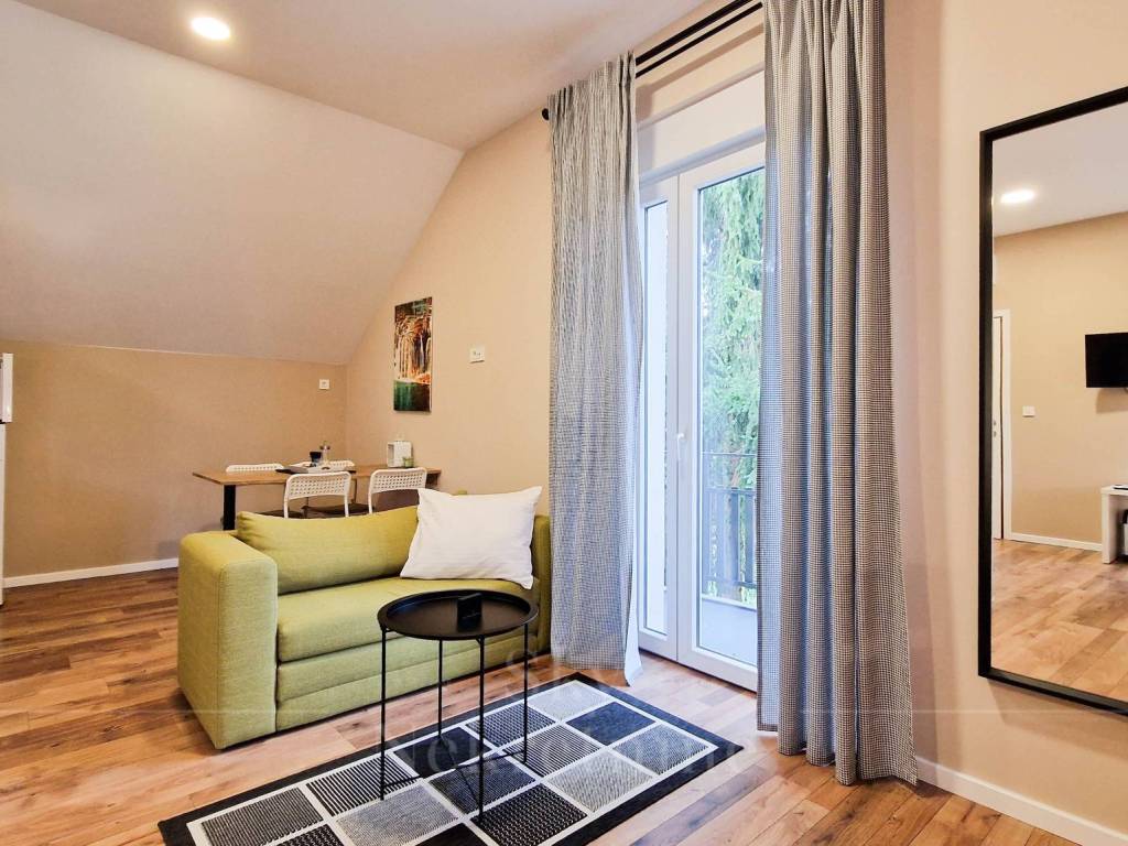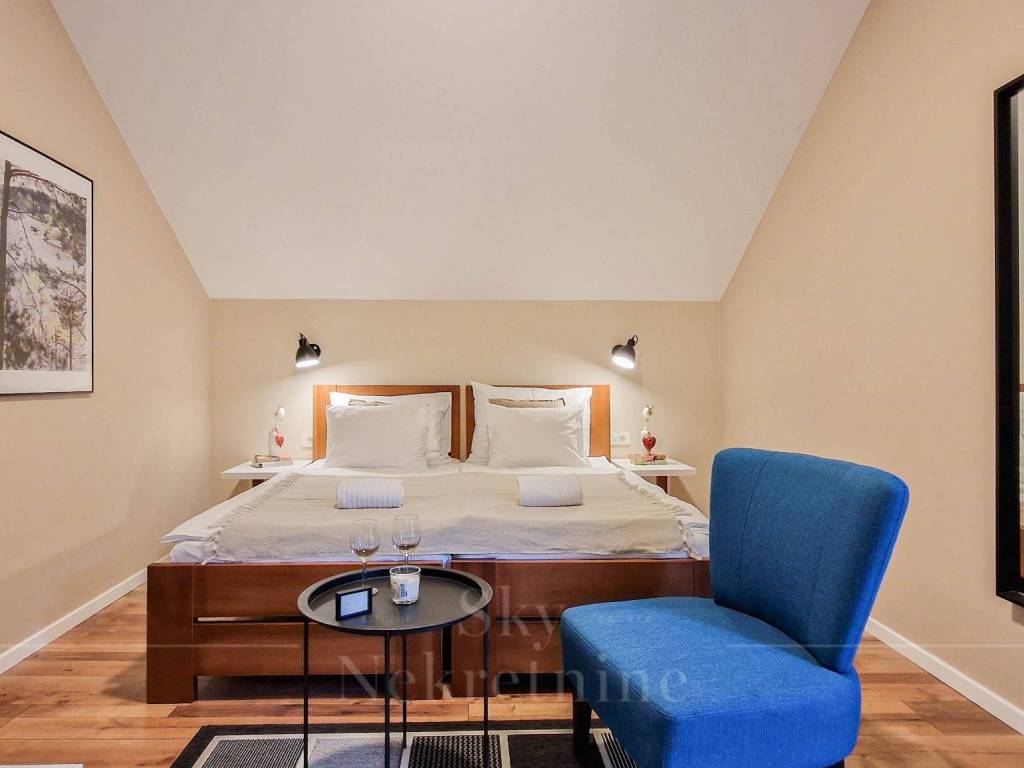 The surface of the house is 200 m2, and extends to the ground floor, first floor and attic. It consists of one room with a bathroom, two studio apartments and one apartment with two rooms and two bathrooms.