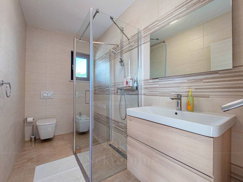 The entire house has floor heating, aluminum windows with sliding option, burglar-proof doors, air conditioners, and the floors have imitation marble tiles, while the stairs to the ground floor are made of marble of the same shade.