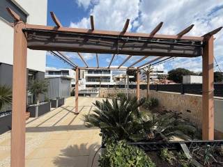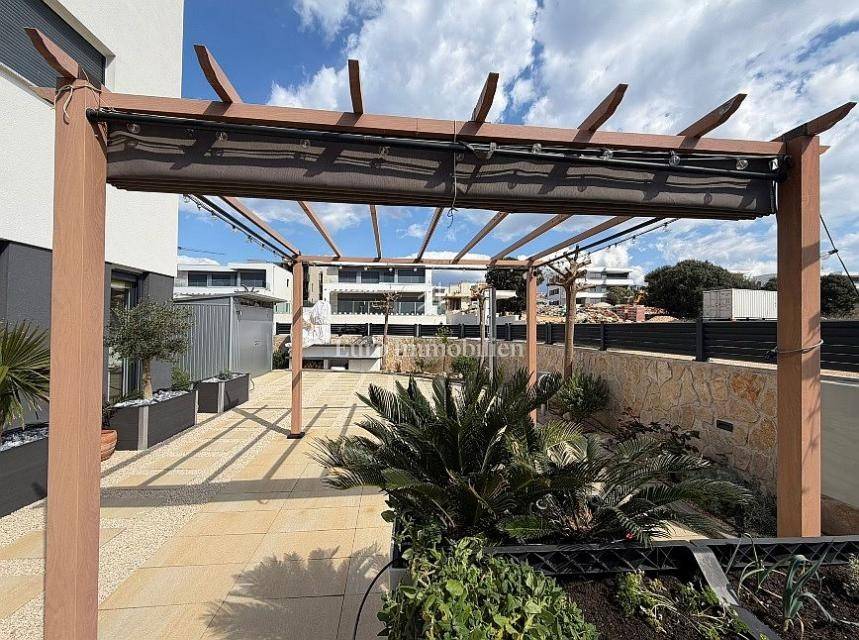The apartment is surrounded by a spacious yard of 135 m², featuring an outdoor shower, a stone barbecue, a storage room, and a pergola providing shade from the sun.