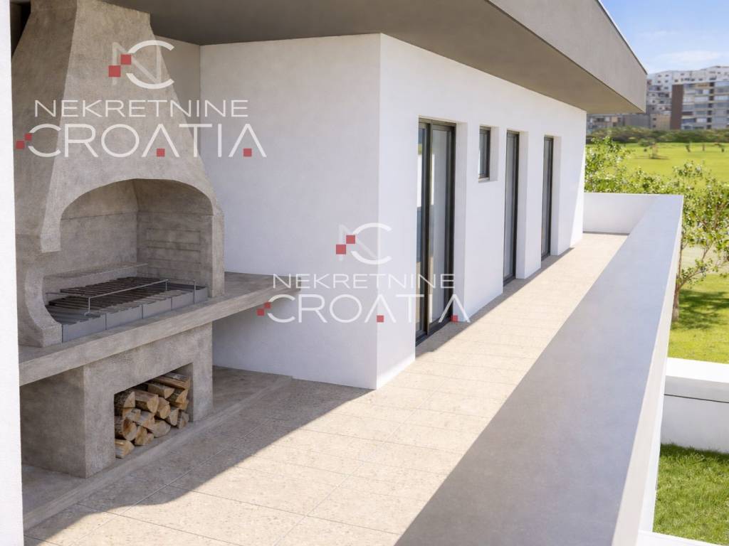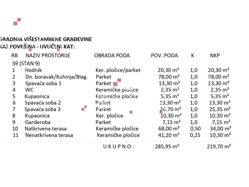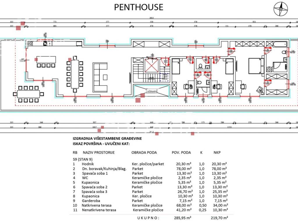 VRHUNSKI penthouse ukupne površine 285.95 m2 i neto korisne površine 219.70 m2 u potpunoj privatnosti uvučenog kata stambene zgrade, sa dizalom koje vodi direktno u stan (pristup preko ključa), pažljivo promišljenog rasporeda: komforni open space prostor sa kuhinjom, blagovaonicom i dnevnim boravkom (78 m2) koji izlazi na prostranu terasu sa pečenjarom, sa velikom glavnom spavaćom sobom (25.35 m2) koja ima vlastitu kupaonicu (tuš i kada) sa WC-om i sobu za garderobu, dok druge 2 spavaće sobe imaju izlaze u zajedničku kupaonicu s WC-om.
