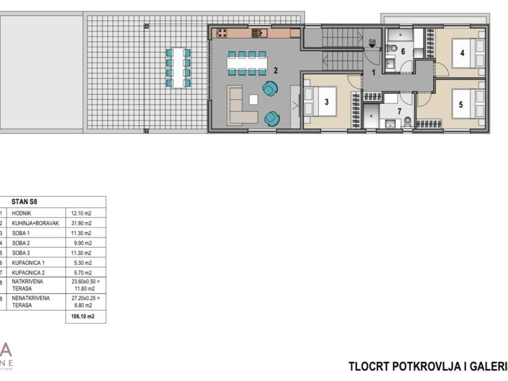 Pag - Mandre, se vende apartamento de tres habitaciones de 106,10 m2 en el ático de un edificio residencial con un total de ocho apartamentos, en construcción, con entrega prevista para 07/2026. Construcción de calidad, calefacción por suelo radiante en cada habitación, persianas eléctricas, azulejos cerámicos en todo el apartamento, etc...