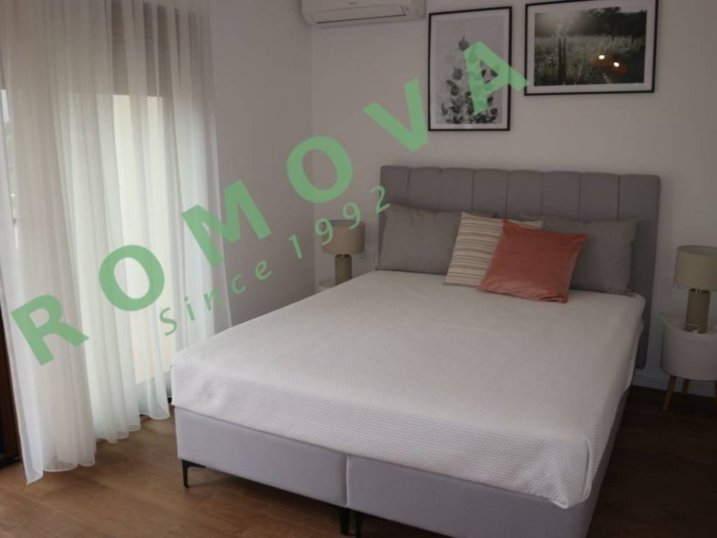 Prekrasna potpuno namještena dvojnica sa uređenim vrtom, ova prekrasna katnica se sastoji od velike dnevne kuhinje i blagovaonice velike spavaće sobe sa terasom, kupatila i ostave u prizemlju. Zatim dvije velike spavaće sobe sa terasom, i kupatila na katu. Kuća je potpuno namještena i opremljena, grijanje na toplotnu pumpu, te klima uređajem. Uređeno i ograđeno dvorište na kojem se nalazi više parkirnih mjesta. Udaljenost do granice sa R.Slovenijom cca 1500 m, do mora cca 6500 m, do Buja cca 3500 m, do Umaga cca 11500 m.