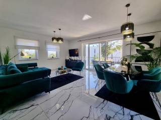 The living room opens onto a balcony with a seating area with a beautiful view of the sea and a well-kept garden with lots of greenery.