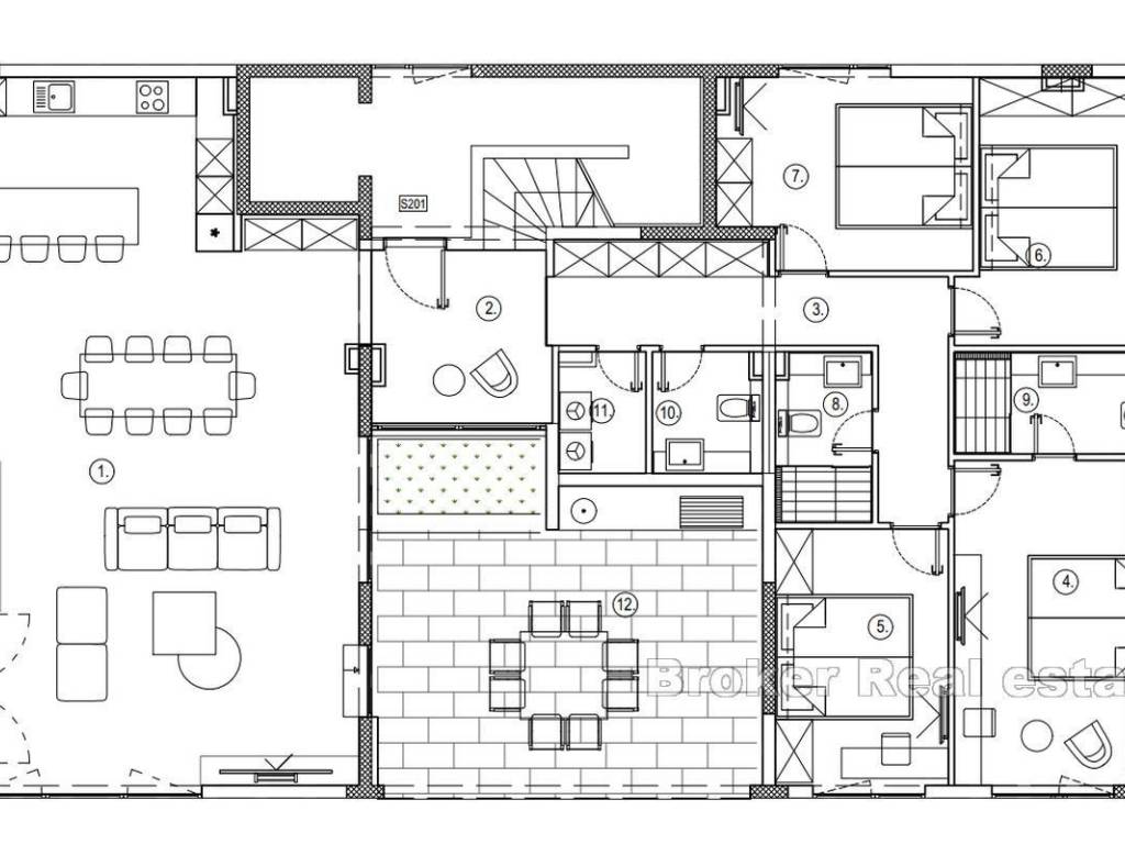 A luxurious penthouse in a new building with panoramic sea views is for sale. The four-bedroom apartment extends over the entire floor of the building on 249 m2 of net usable area. The apartment consists of four bedrooms, one of which is a master suite, one shared bathroom and one toilet, living room, kitchen and dining room with access to the loggia. The apartment is designed in such a way that all common rooms are located on the south side and each offers a view of the sea and the landscaped promenade, while the apartment is sunny through glass walls throughout the day. A staircase leads to a private roof terrace that extends over the entire floor and offers space for various additional amenities. The terrace has a sundeck, an outdoor summer kitchen and a seating area. Other, smaller apartments are available for sale in the same building at the link.