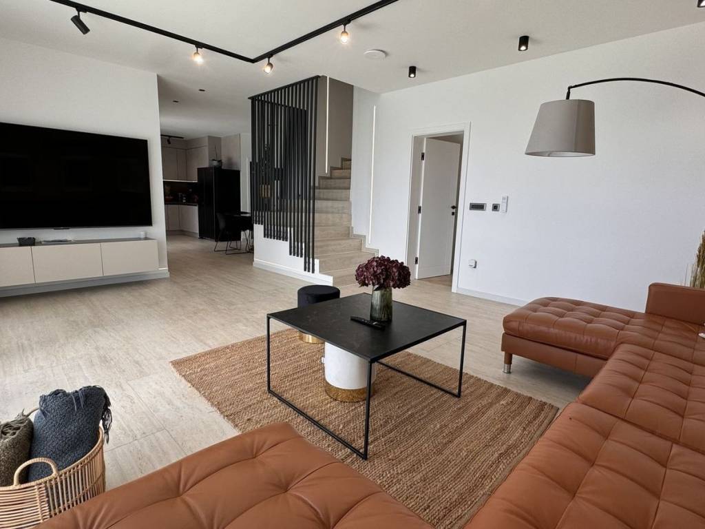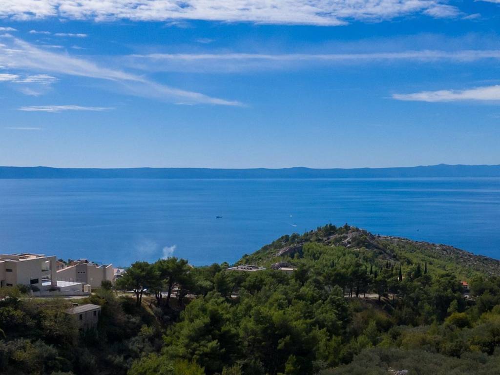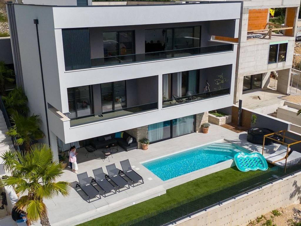 Located in a unique setting on the slopes of Biokovo Mountain, just 4 kilometers from the center of Makarska, this modern newly built villa offers stunning panoramic views of the Adriatic Sea. The villa consists of three luxury residential units, carefully designed to provide maximum comfort and privacy, making it ideal for both living and investment in tourist rental.   Two-story Four-bedroom Apartment This exclusive four-bedroom apartment spans the ground floor and the first floor. The upper floor features three spacious bedrooms, each with its own south-facing balcony, as well as three bathrooms. On the ground floor, there is an additional bedroom, a modern bathroom, a large living room, and an open-concept kitchen. The living room opens onto a large terrace with a pool and sunbathing area, offering uninterrupted sea views.   One-bedroom Apartment – Roh-bau Phase On the first floor, there is a one-bedroom apartment in the roh-bau phase, allowing the future owner the freedom to design the interior according to their preferences. This apartment includes a kitchen, a living room, a bathroom, and a balcony with a sea view.   Three-bedroom Apartment Located on the second floor of the house, the spacious three-bedroom apartment features two bathrooms, an additional room, a large living room, a kitchen, and a dining area. The apartment also has a private balcony with an open sea view.   In front of the house, there are 6 parking spaces. The basement includes two storage rooms with a total area of 40 m², and underfloor heating is installed throughout the entire house. Air conditioning units are present in all rooms, along with electric shutters and high-security doors as additional features. Each apartment has separate electricity and water meters.   This house represents a perfect blend of modern design, luxury, and functionality, set in a peaceful environment with stunning views and close proximity to all necessary amenities. It is ideal for those seeking a premium living space or a profitable investment in tourist rental.