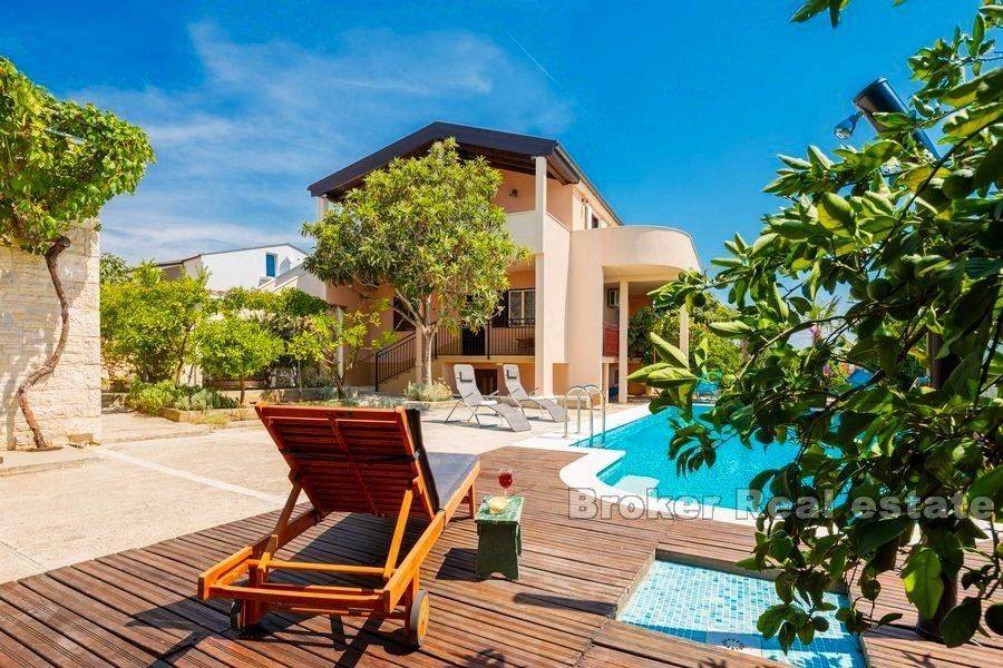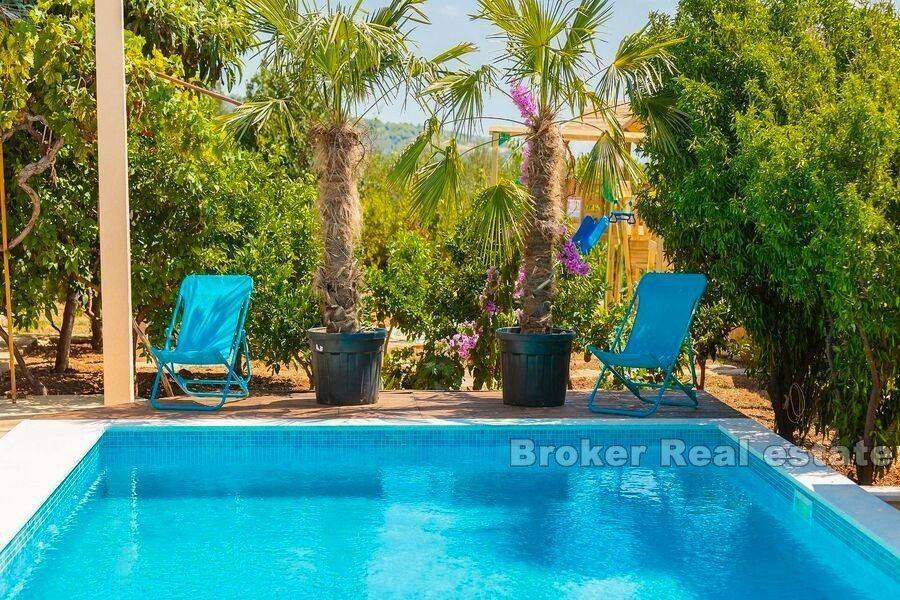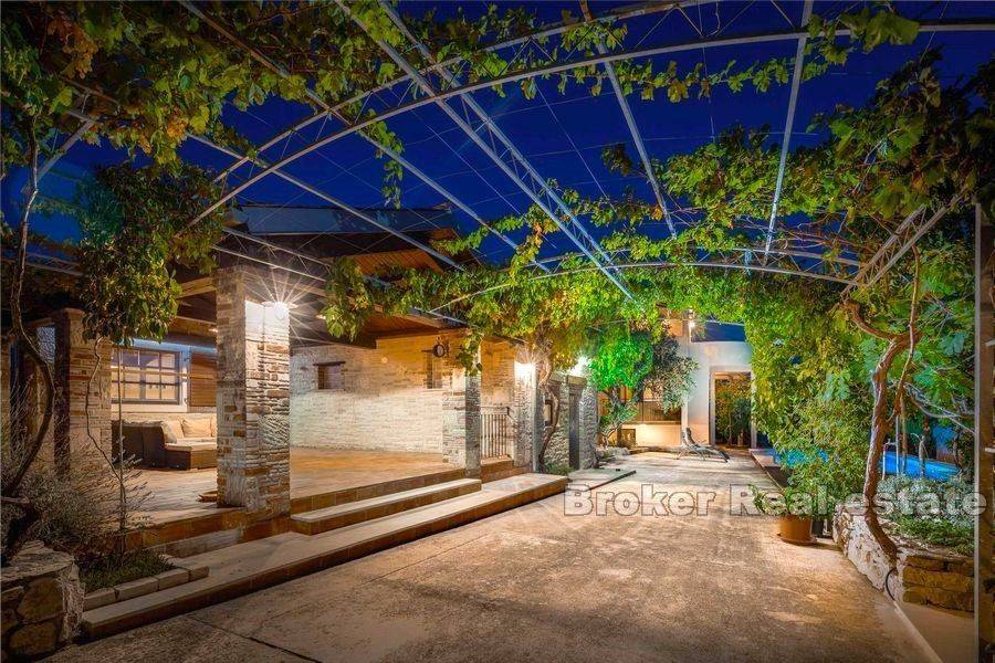 Trogir property with swimming pool and olive grove. The property covers 3,000 m2, of which 1,000 m2 is an olive grove. The property itself consists of several houses and buildings on it: – the main house – guest house – tavern – summer kitchen – chimney – auxiliary facilities The property is located in a quiet Dalmatian town near Trogir. The rustic interior design and the garden full of Mediterranean plants make this property ideal for those buyers who want a property that nurtures the authentic Dalmatian style, peace and privacy. Excellent micro and macro location, close to the beach, restaurants and shops, as well as the proximity of the Unesco city of Trogir (10 minutes) as well as the proximity of the airport and the highway connection.
