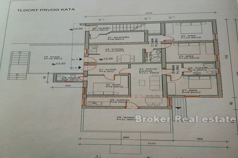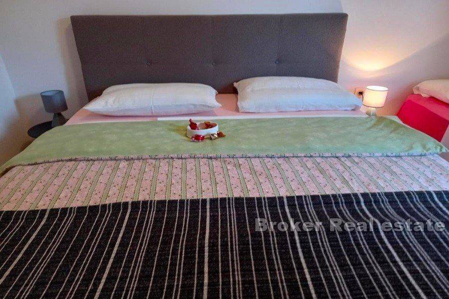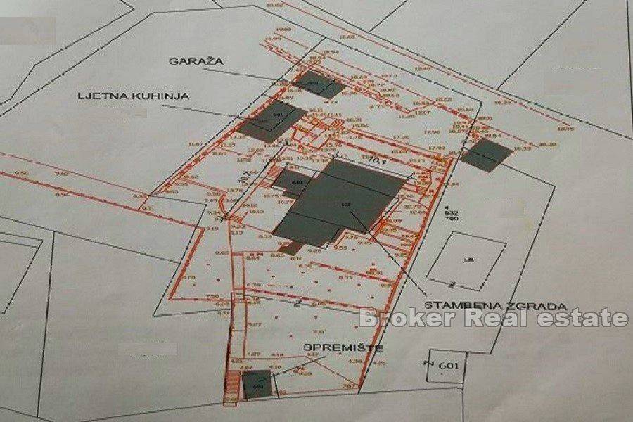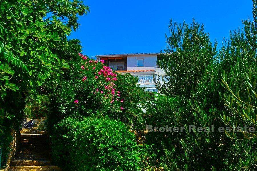 House, first row to the sea, by the beach. The property is entirely south oriented with a sandy beach in front of it where there is a berth and a garage for a boat. In its area of ​​313 m2 it is located on a large plot of 1750 m2 and spreads over 3 floors: – On the ground floor there are two apartments, each with its own terraces; – On the 1st floor there are two other apartments also with terraces; – On the 2nd floor also two apartments with terraces with a fantastic sea view; All 6 apartments are equipped and categorized for tourism. On a large garden full of Mediterranean plants there is an auxiliary building (guest house) with a one bedroom apartment and its terrace facing the sea, a summer kitchen with a pergola designed as a place for gastronomic gatherings, and a garage of 16 m2.