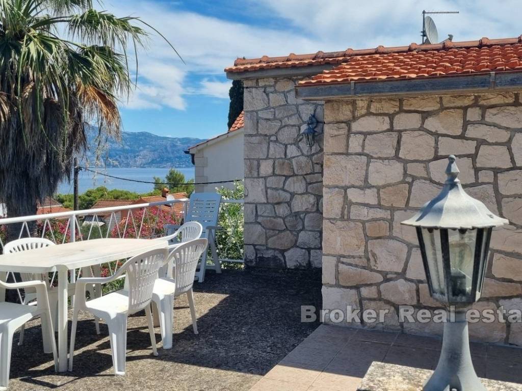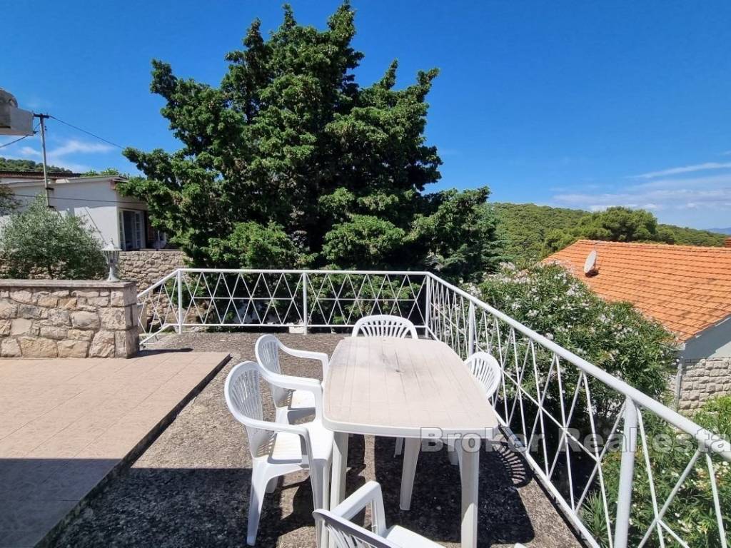 The property, with a total living area of 100 m², is situated on a plot of 410 m². The house, spread over two floors, is divided into two residential units and is completely surrounded by a garden.   On the ground floor, there is an apartment with two bedrooms, a kitchen, a dining room, a living room, and a bathroom. This apartment opens onto a terrace, which is surrounded by a lush garden and a live fence.   An external staircase provides access to the first floor, where there is a studio apartment with a kitchen, a bathroom, and a spacious terrace perfect for relaxation.   The property is surrounded by a large garden that offers enough space for a swimming pool.   The upper floor of the property can be remodeled to provide additional living space.   All basic amenities are within walking distance, and the beautiful beach is only a few minutes’ walk away. The ferry port is a 15-minute drive from the property.   Given its favorable micro-location, the house represents an excellent solution for a family holiday home or a great investment in the tourism business.