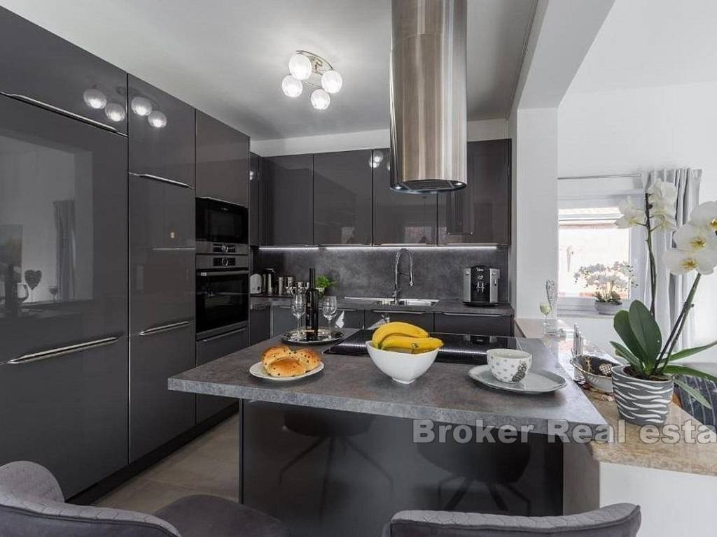 In the immediate vicinity of Poreč, just a few kilometers from the coast, in a quiet place with excellent infrastructure, a beautiful villa with a swimming pool is for sale. On a plot of 628 m2, there is a villa with a living area of 141 m2. The villa has elements of traditional architecture, such as a partially stone facade and blue shutters that add a Mediterranean flair. It consists of two floors; ground floor and first floor. The open-plan ground floor consists of a spacious living room, in the continuation of which there is a dining room and an equipped and modern kitchen with clean lines. On the ground floor there is also a bedroom with its own bathroom and a storage room. Thanks to the large glass walls, the interior and exterior of the villa are connected. Upstairs there are two bedrooms, each of which has its own bathroom and access to a sunny terrace. In the neat and carefully maintained garden there is a swimming pool and a sun deck with deck chairs and a functional summer kitchen with an outdoor fireplace. The villa is equipped with solar panels, which makes it environmentally friendly and energy efficient. Thanks to its location and functionality, it is a great rental investment and at the same time ideal for a peaceful family life.