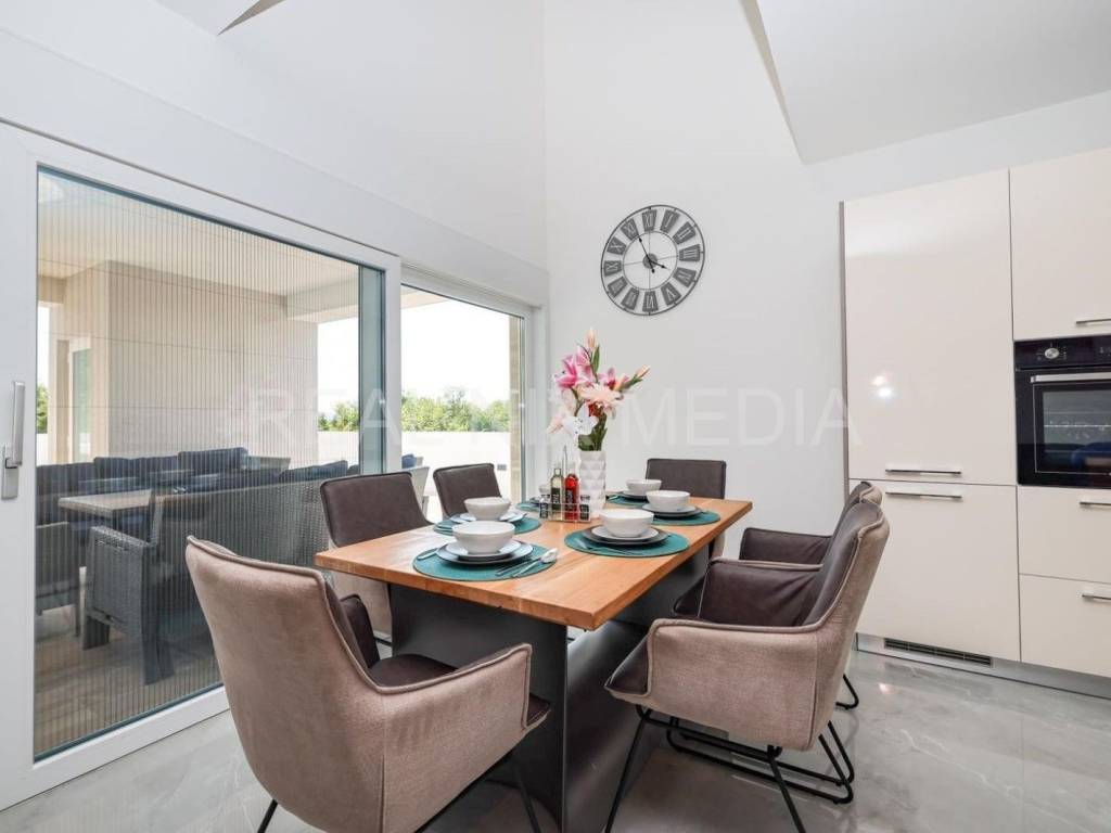 U prizemlju se nalazi kuhinja, blagovaonica i dnevni boravak, hodnik, kupaonica, wc, terasa i sauna. Unutarnje stubište vodi na kat kuće gdje su smještene tri spavaće sobe sa privatnim kupaonicama. Villa je kompletno namještena, idealno za život kao i za bavljenje turističkim najmom.