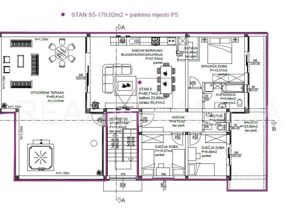 Stan oznake S5 nalazi se na drugom katu zgrade i ima korisnu površinu 179,02 m2+parkirno mjesto P5. Stan sačinjava kuhinja, blagovaonica i dnevni boravak sa izlazom prostranu terasu sa koje se pruža pogled na more; hodnik, kupaonica, wc, ostava te tri spavaće sobe, od kojih dvije spavaće sobe imaju izlaz na balkon.