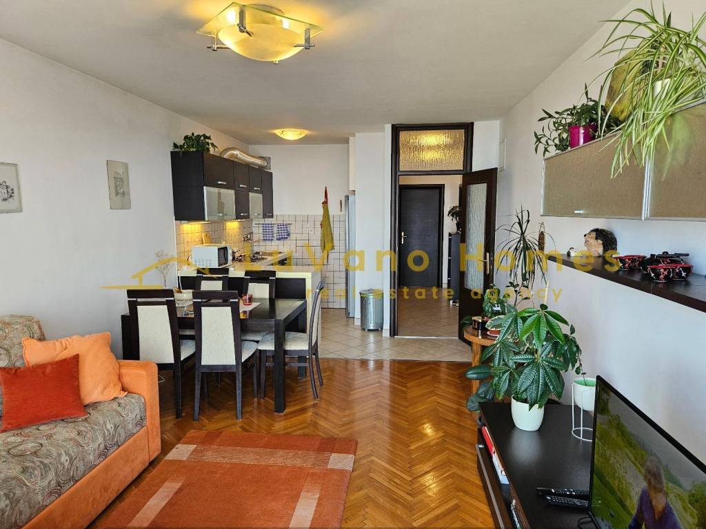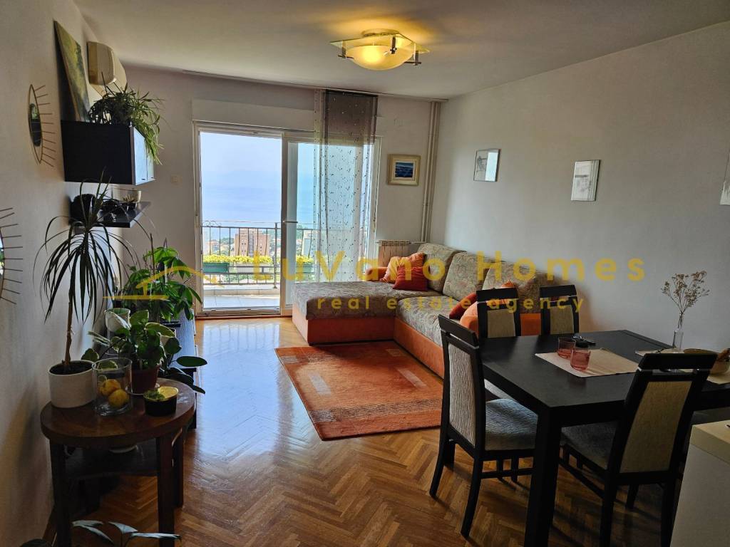 It consists of a lovely and sunny living room with a panoramic view of Kvarner, a loggia, a bathroom with a toilet, two spacious bedrooms, and a hallway.