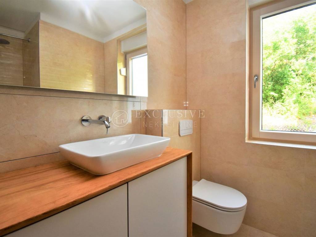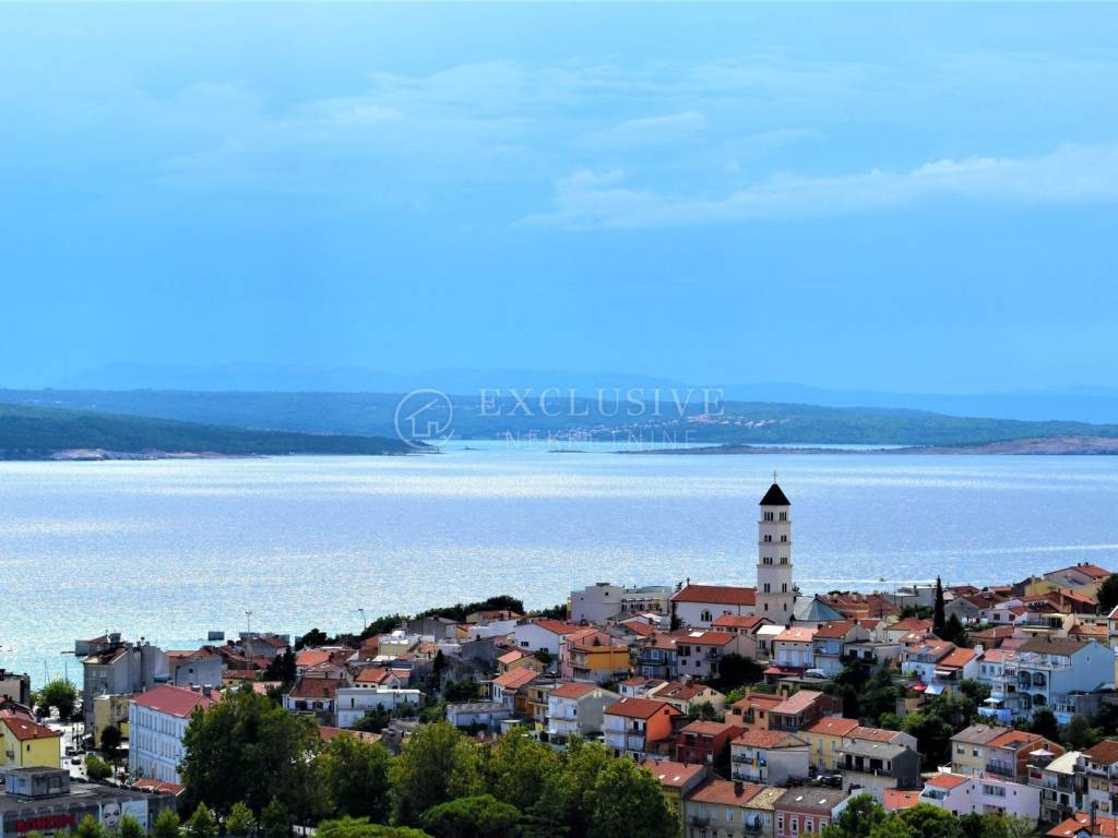 The living area consists of an entrance hall, 2 bedrooms, luxury bathroom and living area that includes a kitchen with dining area, living room and terrace overlooking the sea, city of Crikvenica and the island of Krk. The apartment owns a storage room in the basement, a garden of 134 m2, and the usage of a shared pool and a common storage room of approximately 20m2.