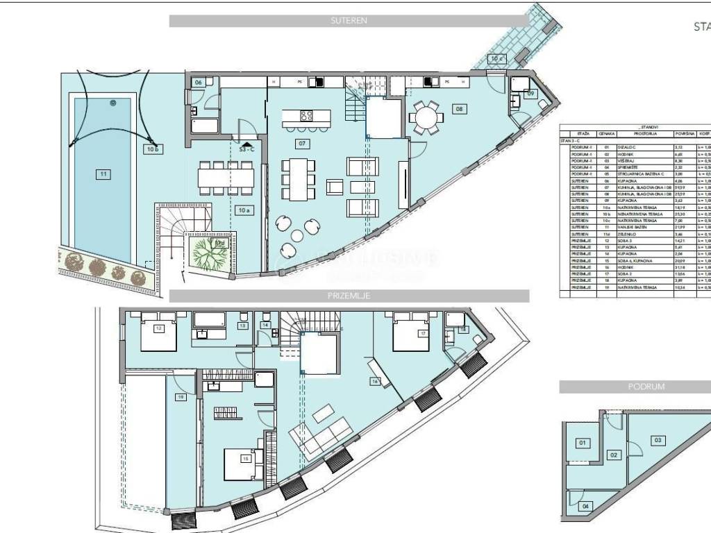 OPATIJA, CENTER, we are selling an exclusive luxury new villa that spreads over two floors with a total net area of 242.27 m2. The lower floor consists of two kitchens with dining rooms, two bathrooms, two living rooms, and two covered terraces (43.49 m2) with access to the outdoor pool (21.99 m2). The upper floor consists of three bedrooms with bathrooms, hallway and one separate bathroom, and a terrace of 10.34 m2. The apartment also has a storage room and laundry, and a total of three garage parking spaces. High quality construction and equipment. Top residential new building in the center of Opatija !!!