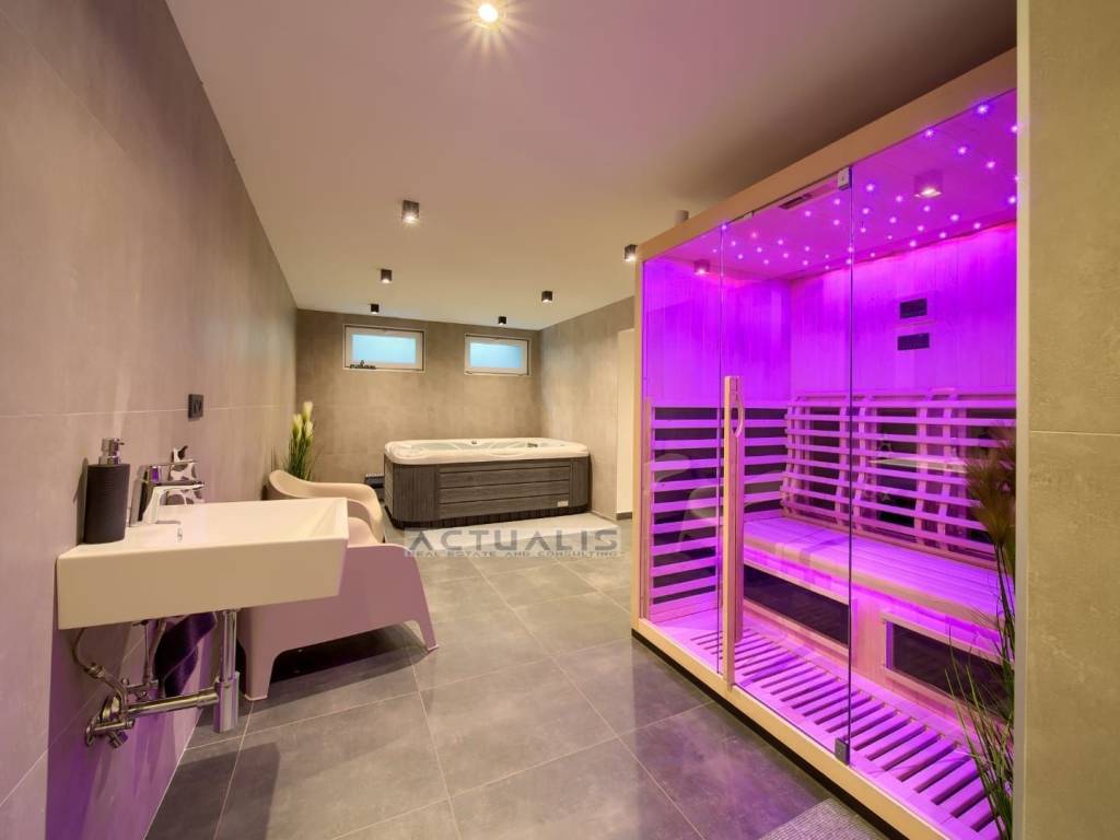 Vila je luksuzno i opremljena i uređena sa svim potrebnim sadržajima gdje se vodilo računa o svim detaljima, lijepo uređena okućnica sa bazenom, vrtnim roštiljem, sjenicom, vanjskim solarnim tušem i automatskim navodnjavanjem lijepo uređene okućnice.