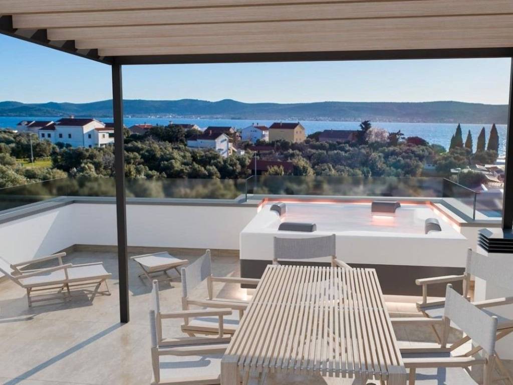 The apartment with a net living area of 51 m2, with two bedrooms is located in a newly built building near Zadar.   The apartment consists of a main entrance that immediately gives access to the common areas, i.e. the kitchen, dining room and living room, which offers access to a spacious loggia. The apartment has two bedrooms, one of which has an en-suite bathroom, as well as a shared bathroom. One bedroom has access to a loggia with a sea view.   The stairs in the shared staircase lead to a private roof terrace with a sundeck and an open view of the sea.   Excellent location near the beach, the main road, as well as all the necessary amenities for living or vacationing. The apartment is 150 meters from the nearest beach, the city of Zadar is less than 20 kilometers away, and the airport is 15 kilometers from the building.