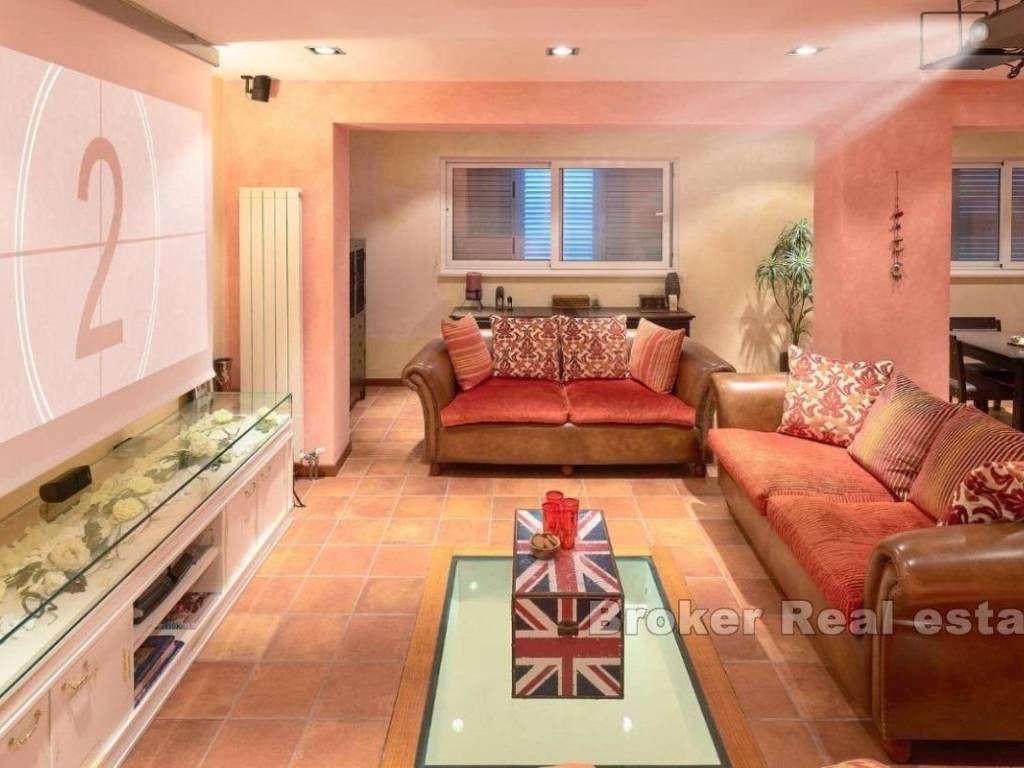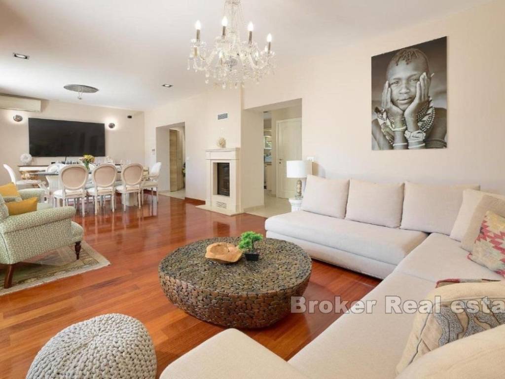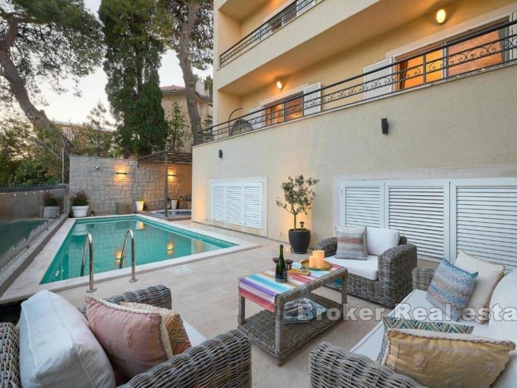 This exceptional villa, located in a prestigious area near the famous Firule Beach, offers everything you could wish for a luxurious seaside lifestyle. The duplex villa, built in 1962, underwent an extensive renovation in 2019 and is furnished with top-quality furniture. Spanning across four levels, the villa provides complete privacy and a wealth of features. In the basement, you will find a billiard table, a wine cellar, a cinema room, a kitchen, and a bedroom with an en-suite bathroom, with direct access to the pool and jacuzzi. The ground floor features a spacious hallway, a comfortable living room, an elegant dining area, a modern kitchen, a pantry, and a guest WC. On the first floor, there are three generous bedrooms, each with a private balcony offering partial sea views, as well as a pantry and two bathrooms, one of which includes a sauna. The second floor boasts a luxurious master suite with a walk-in closet and an office, along with panoramic sea views. The villa is fully air-conditioned and equipped with central heating, and the entire property is protected by a video surveillance and alarm system. Located in a peaceful part of Split, this property is just a few minutes’ walk from the city center and the beach. Given its prime location and extensive range of amenities, it is perfect for a successful vacation rental business or as a luxurious family residence. This unique opportunity is ideal for those seeking a high-quality living space close to the sea and the city, offering maximum privacy and comfort.