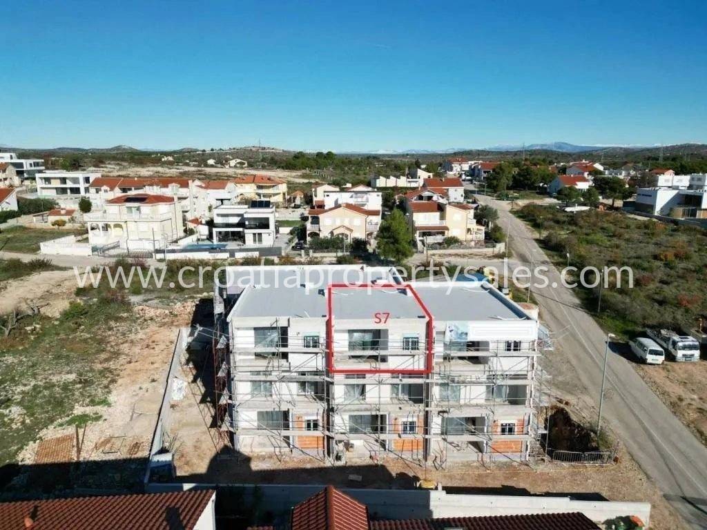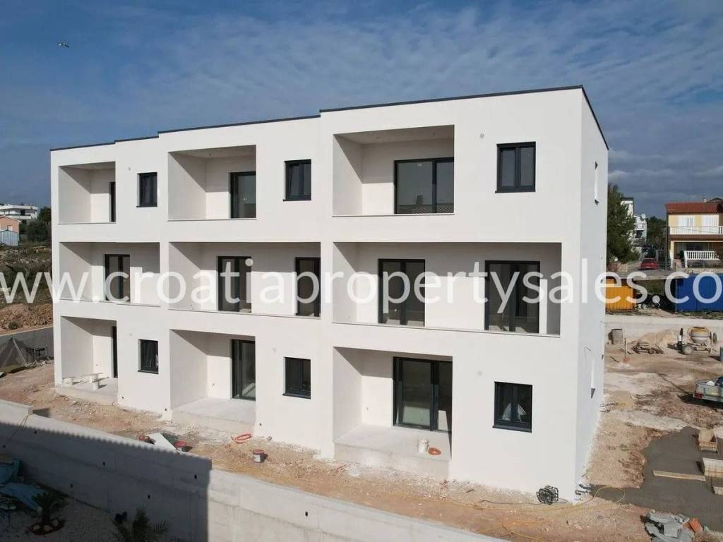 New apartments in a town not far from Sibenik.The building has a total of eight residential units, four duplex apartments and four one-bedroom apartments.The building is built according to modern construction standards, which include PVC and ALU joinery, flooring in a combination of high-class ceramics and laminate, air conditioning, heating/cooling in all rooms, underfloor heating in all rooms except the bedrooms.All duplex apartments have their own courtyards with gardens and two parking spaces, while the one-story apartments on the second floor of the building have one parking space. 3 apartments left:Duplex apartmentsS2 - total net area of 115.56m2 over two levels: ground floor + first floor. The ground floor with a net area of 50.05m2 consists of a hallway, storage room, bathroom, kitchen with dining area, and living room with access to the balcony. The first floor with an area of 48.51m2 consists of a staircase, hallway, two bedrooms, bathroom, terrace, and two balconies. The apartment includes a garden of 110m2 and two parking spaces - 300,000 eurosS4 - total net area of 125.82m2 over two levels: ground floor + first floor. The ground floor net area of 58.34m2 consists of a hallway, storage room, bathroom, kitchen with dining area and living room, and a balcony. The first floor of the apartment has a net area of 57.48m2 and consists of a staircase, hallway, terrace, bathroom, three bedrooms, and two balconies with a sea view. The apartment includes a garden with an area of 40m2 and two parking spaces - 330,000 eurosSecond floor apartments:S7 - SOLD