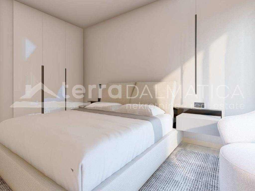 On the ground floor of a modern new building in Makarska, there is a functionally arranged apartment with a living area of 49.18 m², which represents the perfect combination of quality, comfort and modern design. This elegant property is located in a quiet environment, but still close to all amenities, with a beautiful view that further contributes to its attractiveness and value. The apartment consists of an entrance hall, bathroom, bedroom and kitchen, dining room and living room connected into an open, bright and airy space. The apartment has two exits to the outdoor space - from the bedroom there is an exit to a covered terrace of 3 m², while from the living room there is an exit to an uncovered terrace of 9.61 m² and a private garden of 14 m², perfect for relaxing or gardening. Special attention has been paid to the quality of materials and equipment. The apartment is equipped with first-class parquet floors, Italian ceramic tiles, underfloor heating in the bathroom, air conditioning in every room, security doors, ALU-PVC joinery with electric shutters and tempered glass on the balcony railings. Each room has TV, satellite and internet connections, which allows for complete digital comfort. The building was built according to the highest energy efficiency standards and carries an A+ energy certificate, thanks to advanced thermal and sound insulation. Tenants will have access to two floors of underground garages with the option of purchasing a parking space. A bar and a shared swimming pool are planned as part of the complex, and the horticulturally decorated Mediterranean-style environment further enriches the experience of living in this luxurious building. Makarska is one of the most desirable places to live and vacation on the Croatian coast, located between the Biokovo mountain and the crystal clear Adriatic Sea. The city is known for its long pebble beaches, picturesque waterfront, numerous cafes, restaurants and shops, but also for its rich cultural