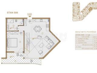 The apartment extends through the 3rd floor and the gallery of the newly built residential and commercial complex, which consists of 2 underground and 3 above-ground floors with galleries. The area of ​​the apartment is 106.55 m2. The apartment consists of a living room with a kitchen and a dining room, 2 bedrooms, 2 bathrooms, a loggia and a roof terrace as part of the gallery. The apartment is heated by air conditioning and floor heating in the bathroom. The apartment offers a view of the city of Poreč and the sea, thus giving a higher quality housing dimension. High-quality materials were used in the construction, from carpentry, sanitary ware, floor coverings. The project itself is characterized by modern design, comfort and luxury.