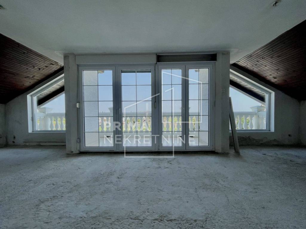 The attic of 85.6 m2 is Rohbau and the layout, which is the same as in the lower two apartments, can be changed if necessary. It has two balconies, one of which has an exit from the living room, and the other from the stairwell.