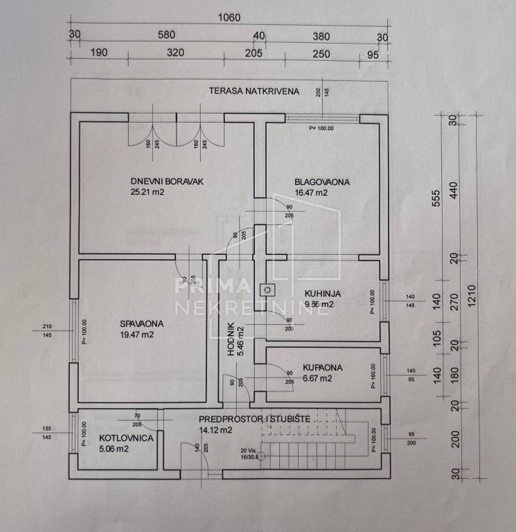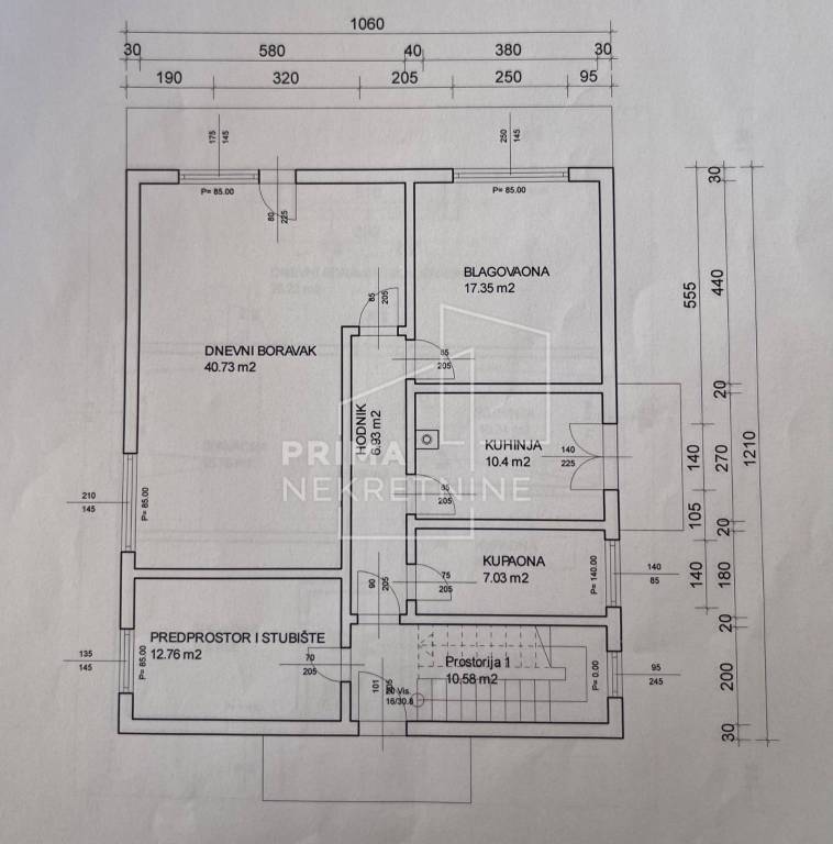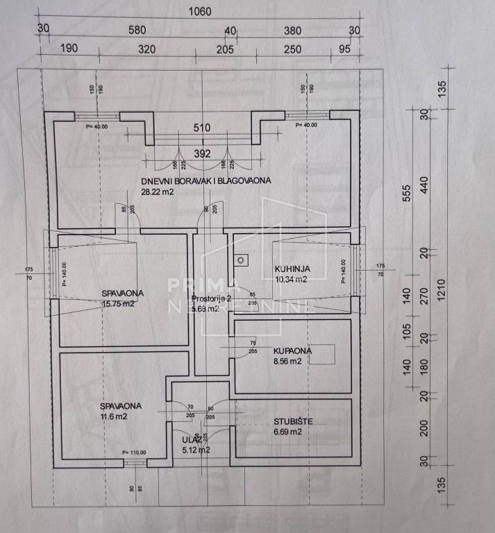Apartment on the ground floor of 102.32 m2 consists of: hallway, living room connected to the kitchen and dining room, two bedrooms, bathroom and large balcony Apartment on the first floor of 105.61 m2 consists of: hallway, living room, kitchen with a dining room, two bedrooms, bathrooms, three balconies with exits from the living room, kitchen and hallway.