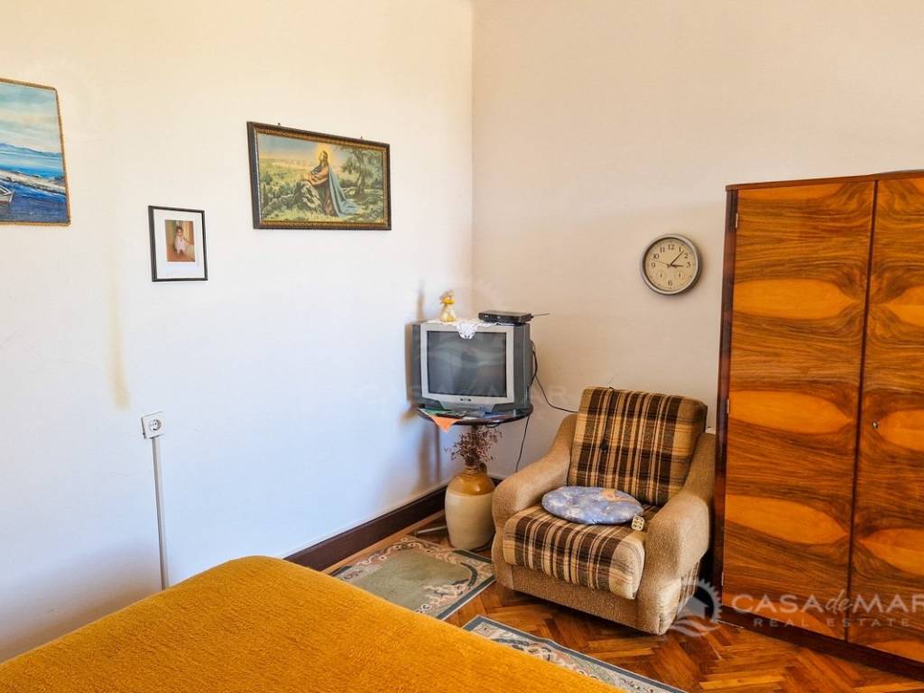 The residential part of the house, situated on the ground and first floors, consists of three bedrooms, a bathroom, two living rooms, a kitchen with a dining area, and a storage room. The house features two terraces and a small balcony, offering panoramic sea views, especially from the main terrace on the upper floor.